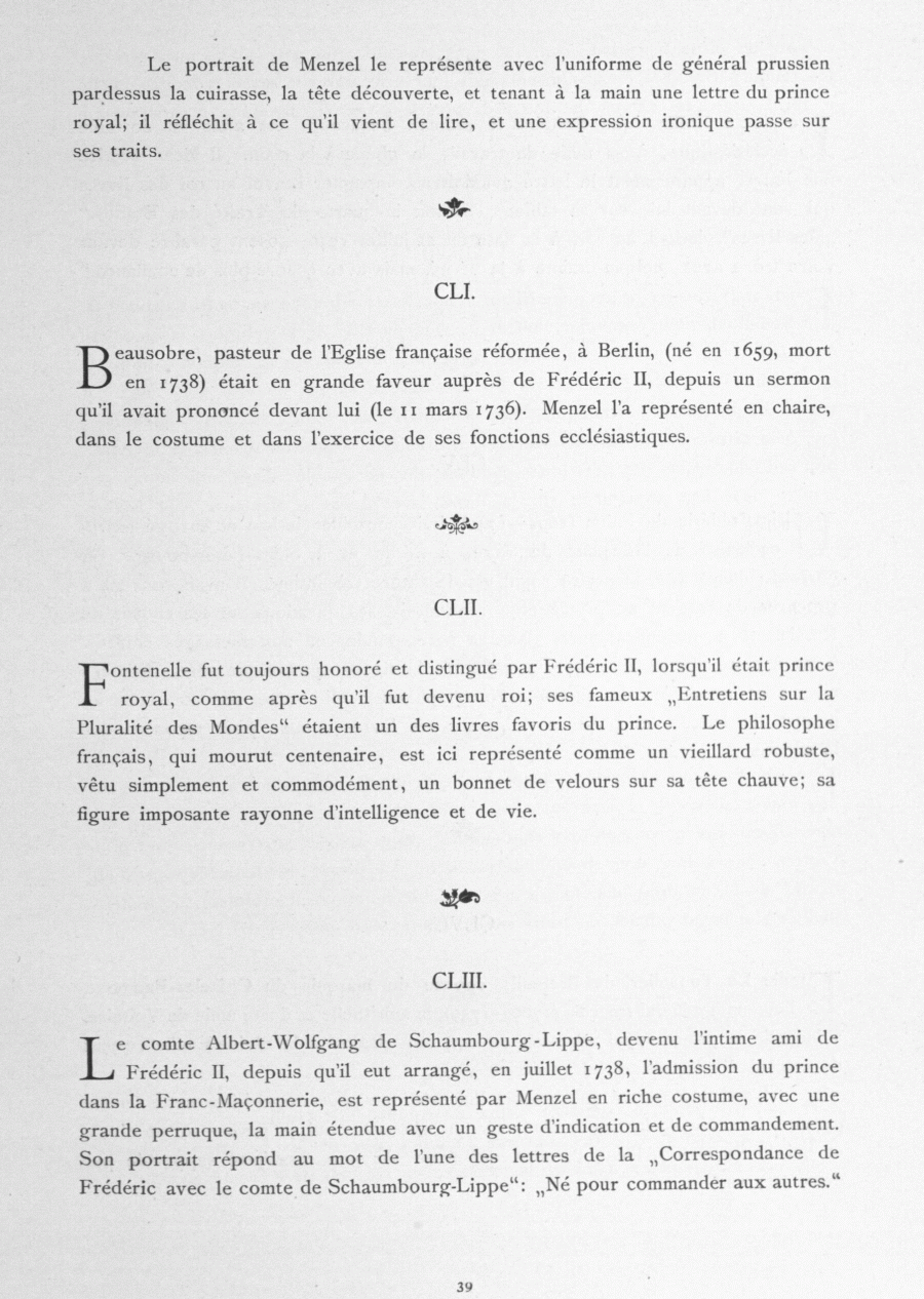 Fontenelle fut toujours honoré et distingué par Frédéric II, lorsqu'il était prince royal, comme après qu'il fut devenu roi; ses fameux „Entretiens sur la Pluralité des Mondes“ étaient un des livres favoris du prince. Le philosophe français, qui mourut centenaire, est ici représenté comme un vieillard robuste, vêtu simplement et commodément, un bonnet de velours sur sa tête chauve; sa figure imposante rayonne d'intelligence et de vie.