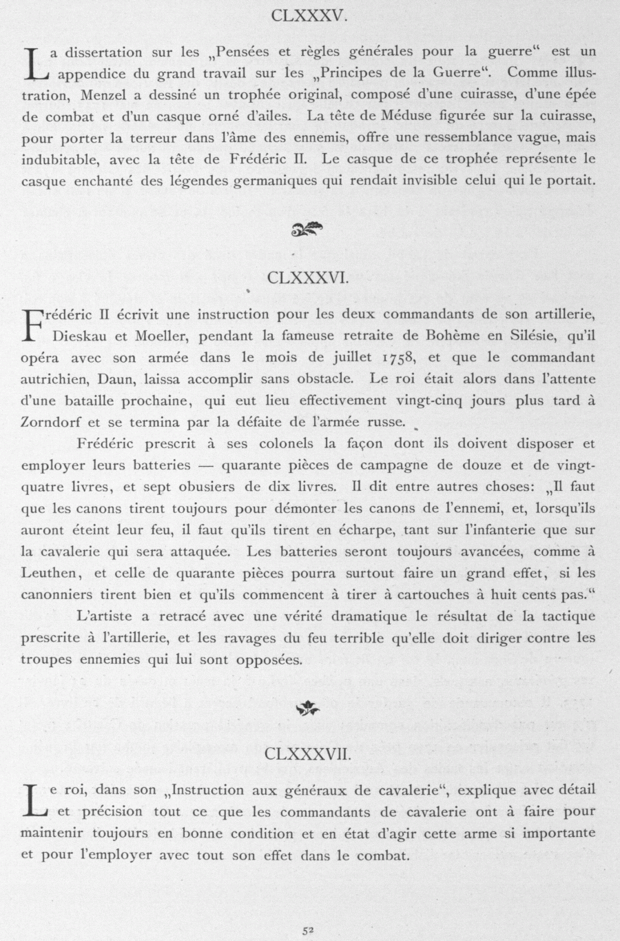 La dissertation sur les „Pensées et règles générales pour la guerre“ est un appendice du grand travail sur les „Principes de la Guerre“ . Comme illus-tration, Menzel a dessiné un trophée original, composé d'une cuirasse, d'une épée de combat et d'un casque orné d'ailes. La tète de Méduse figurée sur la cuirasse, pour porter la terreur dans l'âme des ennemis, offre une ressemblance vague, mais indubitable, avec la tète de Frédéric II. Le casque de ce trophée représente le casque enchanté des légendes germaniques qui rendait invisible celui qui le portait.