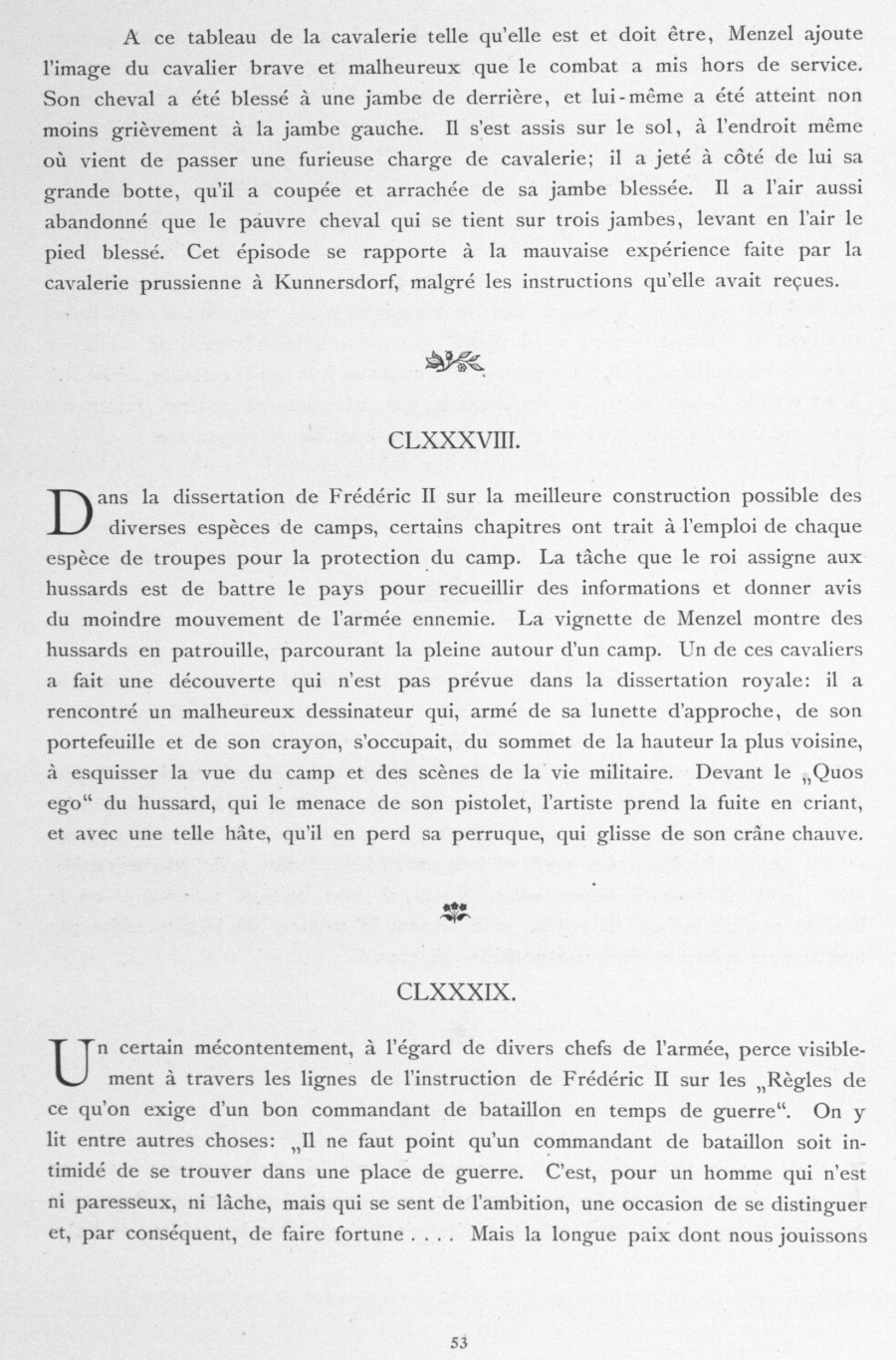 Dans la dissertation de Frédéric II sur la meilleure construction possible des diverses espèces de camps, certains chapitres ont trait à l'emploi de chaque espèce de troupes pour la protection du camp. La tâche que le roi assigne aux hussards est de battre le pays pour recueillir des informations et donner avis du moindre mouvement de l'armée ennemie. La vignette de Menzel montre des hussards en patrouille, parcourant la pleine autour d'un camp. Un de ces cavaliers a fait une découverte qui n'est pas prévue dans la dissertation royale: il a rencontré un malheureux dessinateur qui, armé de sa lunette d'approche, de son portefeuille et de son crayon, s'occupait, du sommet de la hauteur la plus voisine, à esquisser la vue du camp et des scènes de la vie militaire. Devant le „Quos ego“ du hussard, qui le menace de son pistolet, l'artiste prend la fuite en criant, et avec une telle hâte, qu'il en perd sa perruque, qui glisse de son crâne chauve.