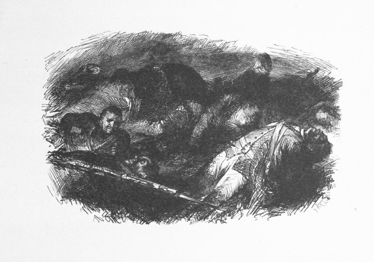186. Groupe de morts et de blessés étendus sur un champ de bataille. (Gravure de Müller.)