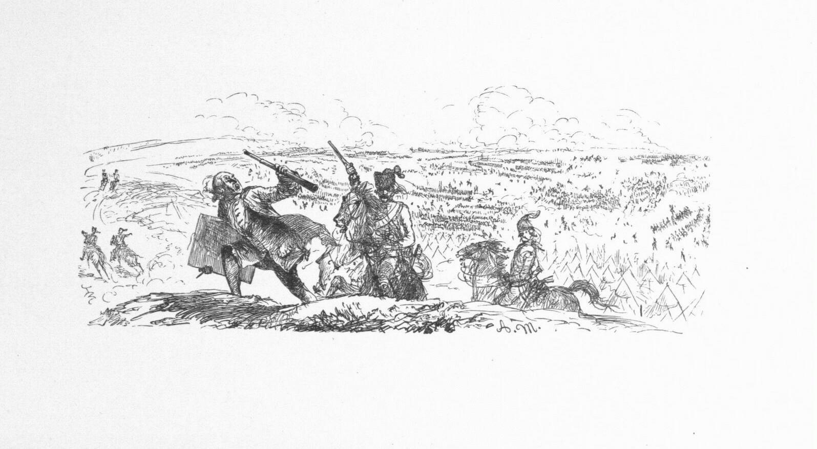 188. Hussards en patrouille autour d'un camp. (Dissertation sur les „Éléments de Castramétrie et de Tactique“. - Gravure de Müller.)