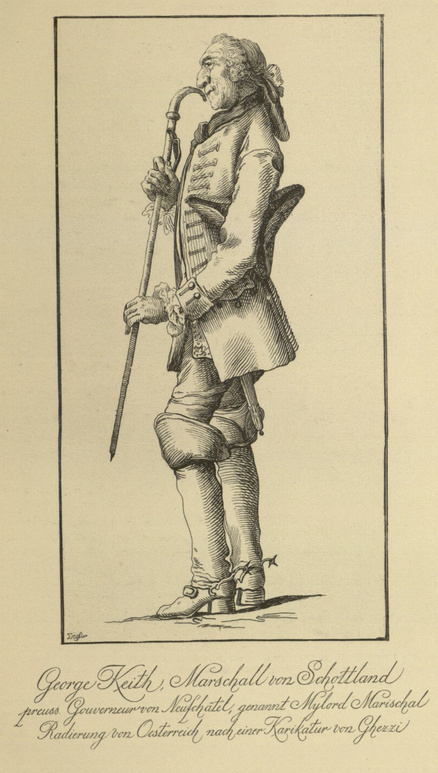 George Keith, Marschall von Schottland, preußischer Gouverneur von Neuchâtel, genannt Mylord Marischal. Radierung von Oesterreich nach einer Karikatur von Ghezzi.
