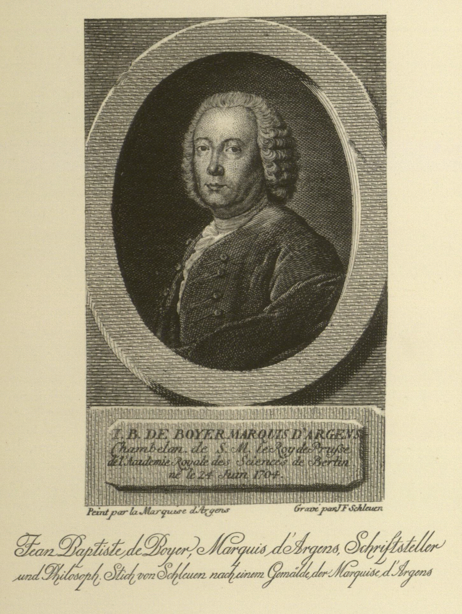 Jean Baptiste de Boyer, marquis d'Argens, Schriftsteller und Philosoph. Stich von Schienen nach einem Gemälde der marquise d'Argens.