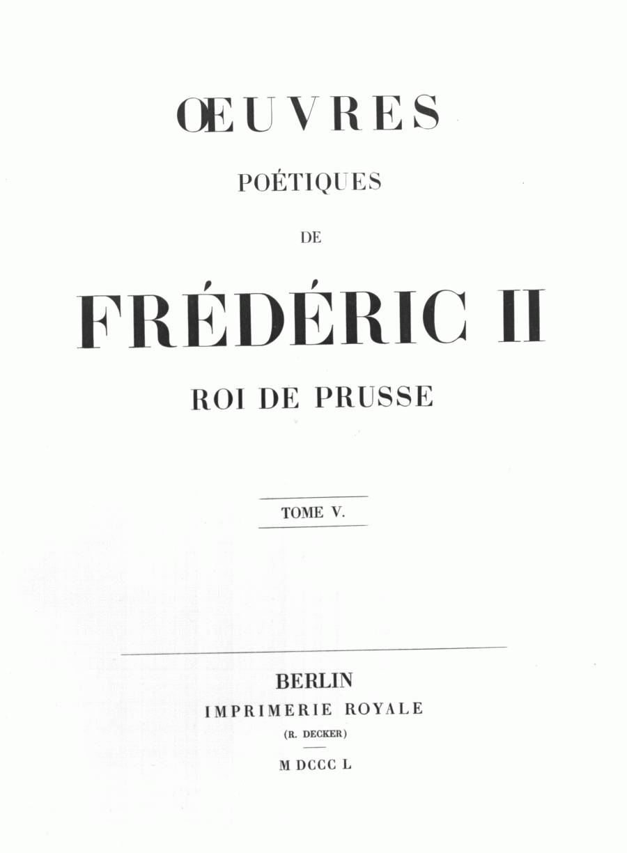 ŒUVRES POÉTIQUES DE Frédéric II ROI DE PRUSSE TOME V. BERLIN IMPRIMERIE ROYALE (R. DECKER) MDCCCL