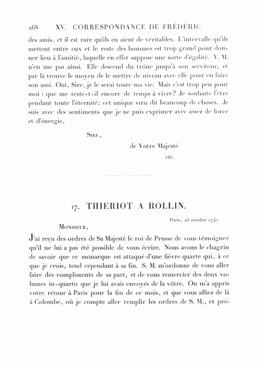 <268> des amis, et il est rare qu'ils en aient de véritables. L'intervalle qu'ils mettent entre eux et le reste des hommes est trop grand pour donner lieu à l'amitié, laquelle en effet suppose une sorte d'égalité. V. M. n'en use pas ainsi. Elle descend du trône jusqu'à son serviteur, et par là trouve le moyen de le mettre de niveau avec elle pour en faire son ami. Oui, Sire, je le serai toute ma vie. Mais c'est trop peu pour moi : que me reste-t-il encore de temps à vivre? Je souhaite l'être pendant toute l'éternité; cet unique vœu dit beaucoup de choses. Je suis avec des sentiments que je ne puis exprimer avec assez de force et d'énergie,