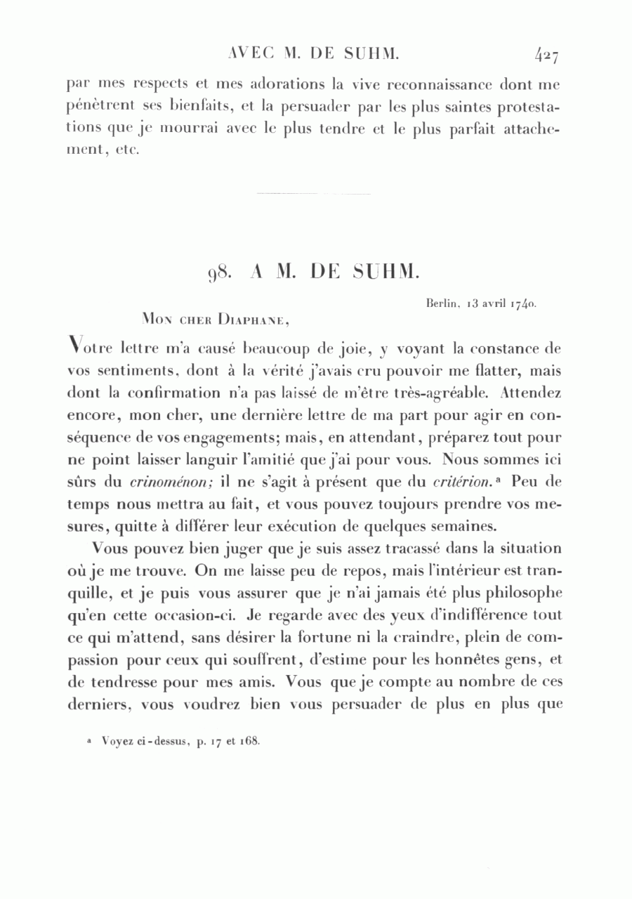 Votre lettre m'a causé beaucoup de joie, y voyant la constance de vos sentiments, dont à la vérité j'avais cru pouvoir me flatter, mais dont la confirmation n'a pas laissé de m'être très-agréable. Attendez encore, mon cher, une dernière lettre de ma part pour agir en conséquence de vos engagements; mais, en attendant, préparez tout pour ne point laisser languir l'amitié que j'ai pour vous. Nous sommes ici sûrs du crinoménon; il ne s'agit à présent que du critérion.a Peu de temps nous mettra au fait, et vous pouvez toujours prendre vos mesures, quitte à différer leur exécution de quelques semaines.