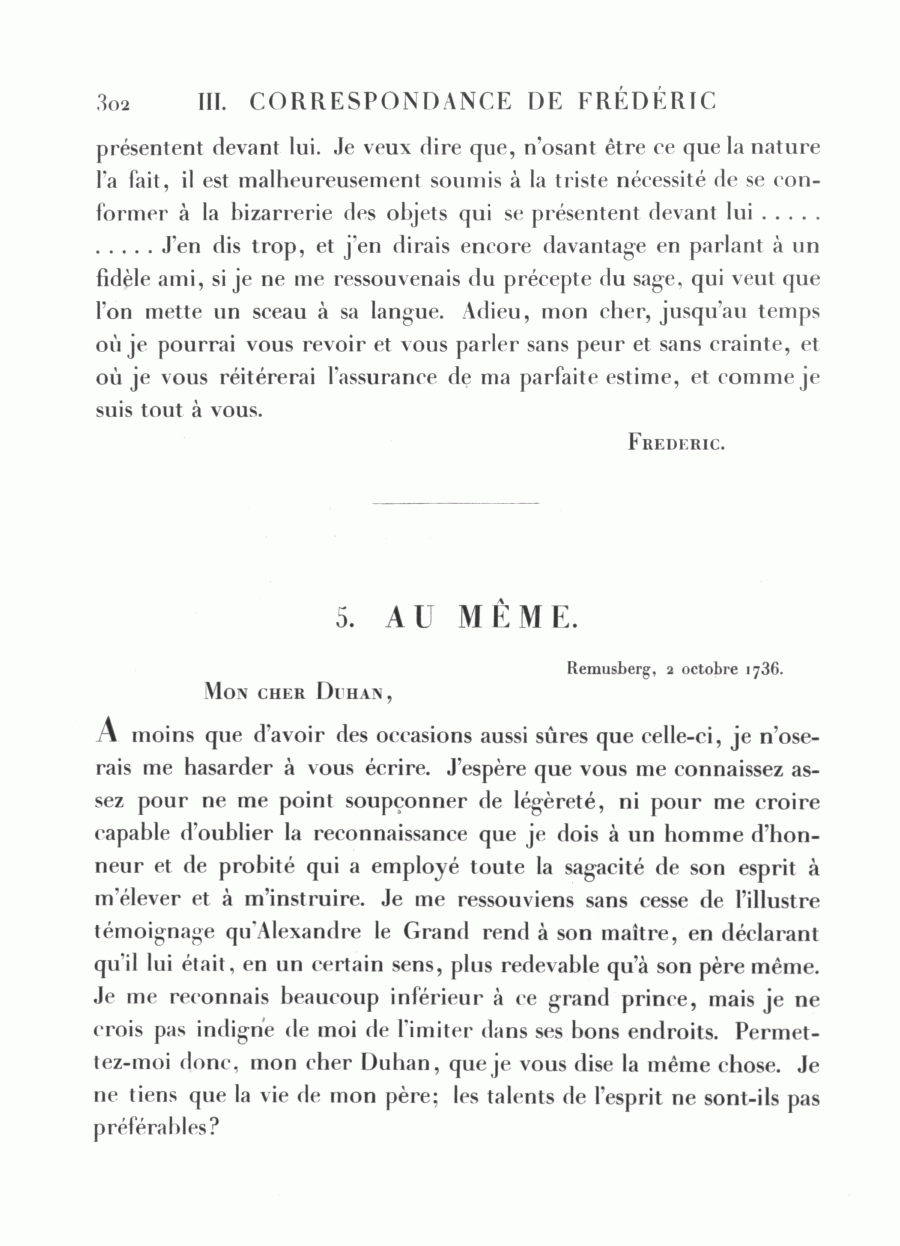 A moins que d'avoir des occasions aussi sûres que celle-ci, je n'oserais me hasarder à vous écrire. J'espère que vous me connaissez assez pour ne me point soupçonner de légèreté, ni pour me croire capable d'oublier la reconnaissance que je dois à un homme d'honneur et de probité qui a employé toute la sagacité de son esprit à m'élever et à m'instruire. Je me ressouviens sans cesse de l'illustre témoignage qu'Alexandre le Grand rend à son maître, en déclarant qu'il lui était, en un certain sens, plus redevable qu'à son père même. Je me reconnais beaucoup inférieur à ce grand prince, mais je ne crois pas indigne de moi de l'imiter dans ses bons endroits. Permettez-moi donc, mon cher Duhan, que je vous dise la même chose. Je ne tiens que la vie de mon père; les talents de l'esprit ne sont-ils pas préférables?
