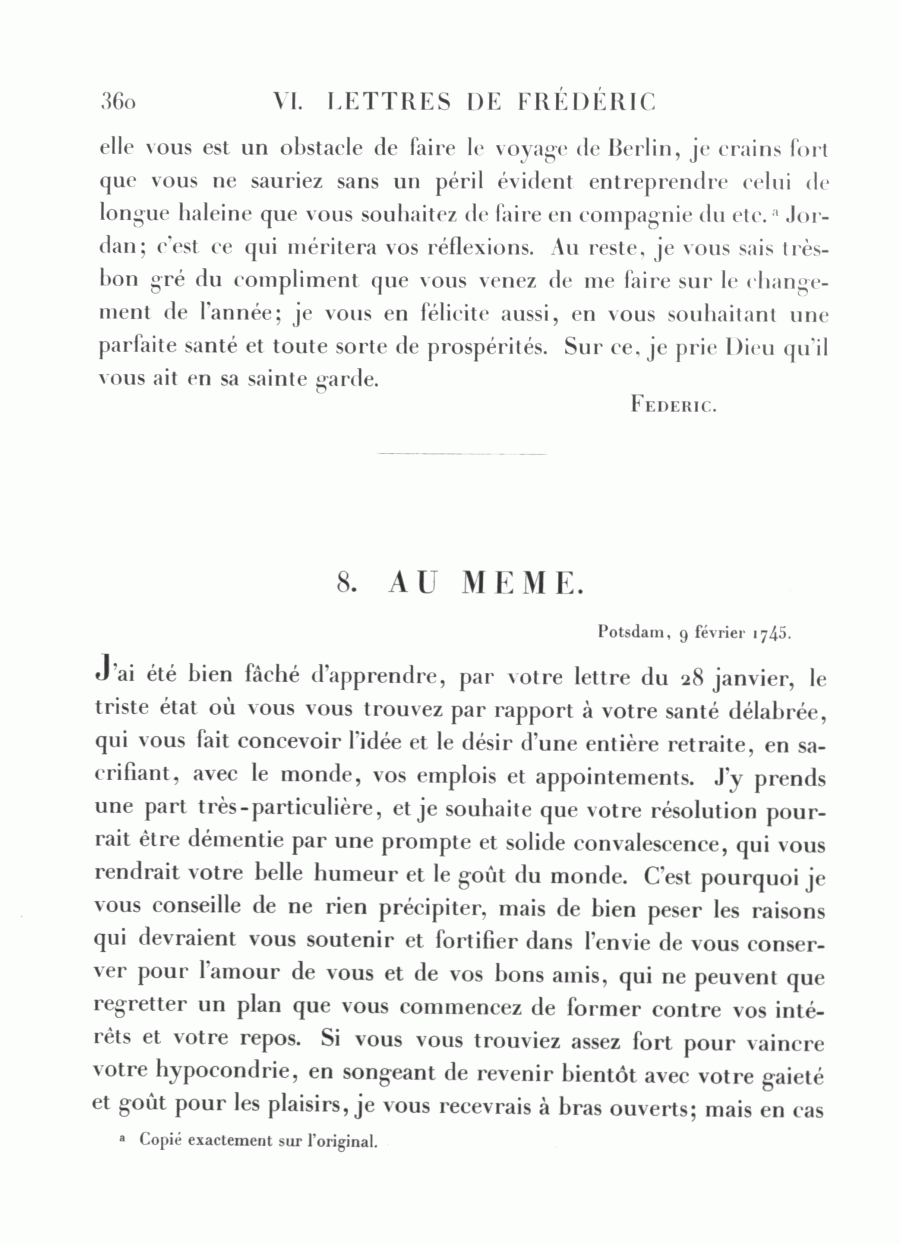 <360> elle vous est un obstacle de faire le voyage de Berlin, je crains fort que vous ne sauriez sans un péril évident entreprendre celui de longue haleine que vous souhaitez de faire en compagnie du etc.a Jordan; c'est ce qui méritera vos réflexions. Au reste, je vous sais très-bon gré du compliment que vous venez de me faire sur le changement de l'année; je vous en félicite aussi, en vous souhaitant une parfaite santé et toute sorte de prospérités. Sur ce, je prie Dieu qu'il vous ait en sa sainte garde.