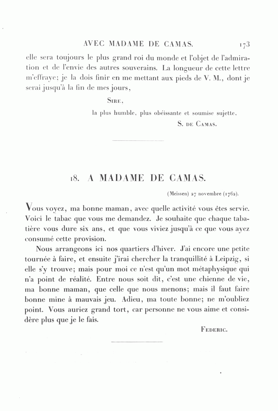 Frédéric à madame de Camas, (Meissen), 27 novembre (1762)Id: d385_ag509-18_004018000