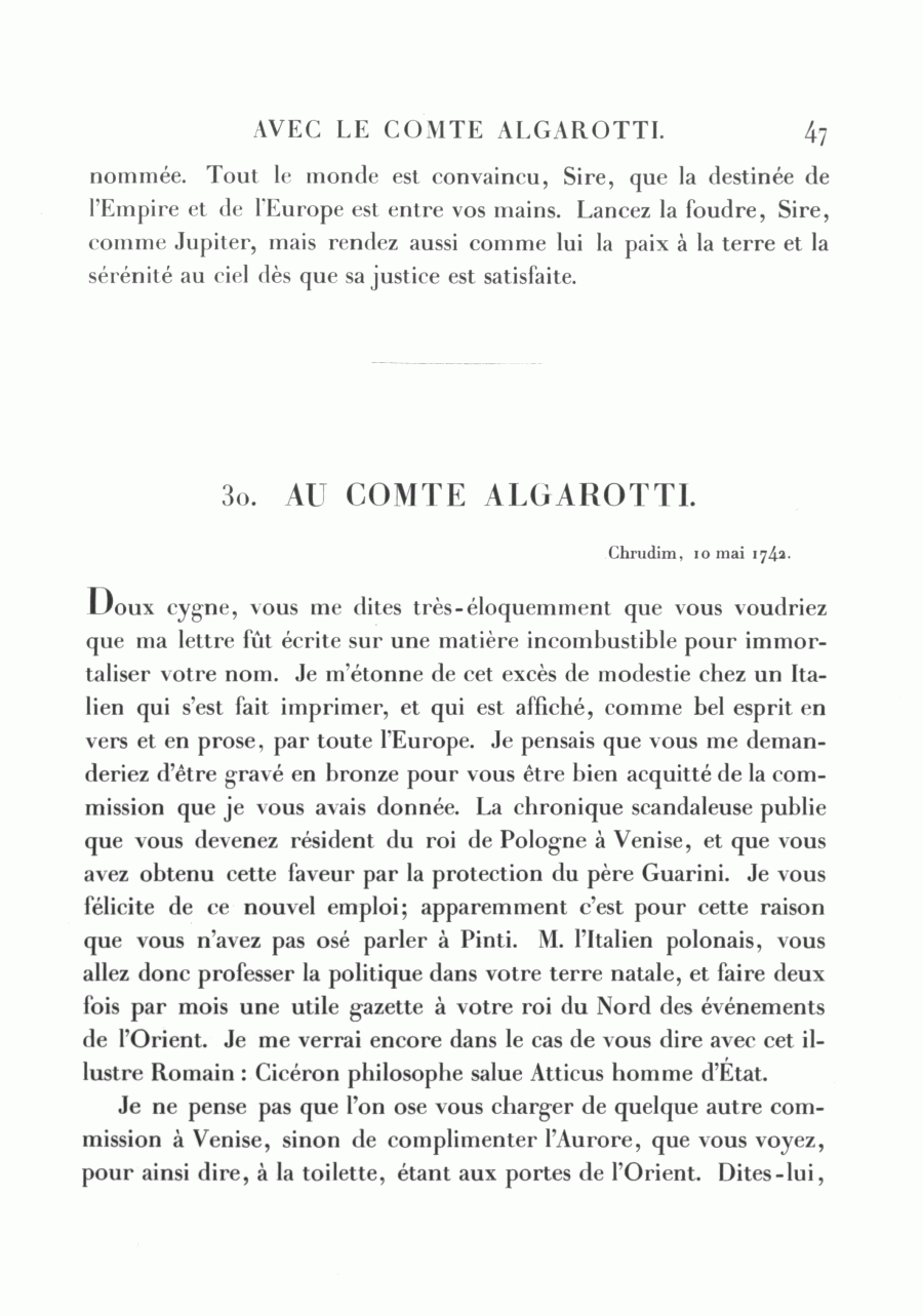 Doux cygne, vous me dites très-éloquemment que vous voudriez que ma lettre fût écrite sur une matière incombustible pour immortaliser votre nom. Je m'étonne de cet excès de modestie chez un Italien qui s'est fait imprimer, et qui est affiché, comme bel esprit en vers et en prose, par toute l'Europe. Je pensais que vous me demanderiez d'être gravé en bronze pour vous être bien acquitté de la commission que je vous avais donnée. La chronique scandaleuse publie que vous devenez résident du roi de Pologne à Venise, et que vous avez obtenu cette faveur par la protection du père Guarini. Je vous félicite de ce nouvel emploi; apparemment c'est pour cette raison que vous n'avez pas osé parler à Pinti. M. l'Italien polonais, vous allez donc professer la politique dans votre terre natale, et faire deux fois par mois une utile gazette à votre roi du Nord des événements de l'Orient. Je me verrai encore dans le cas de vous dire avec cet illustre Romain : Cicéron philosophe salue Atticus homme d'État.