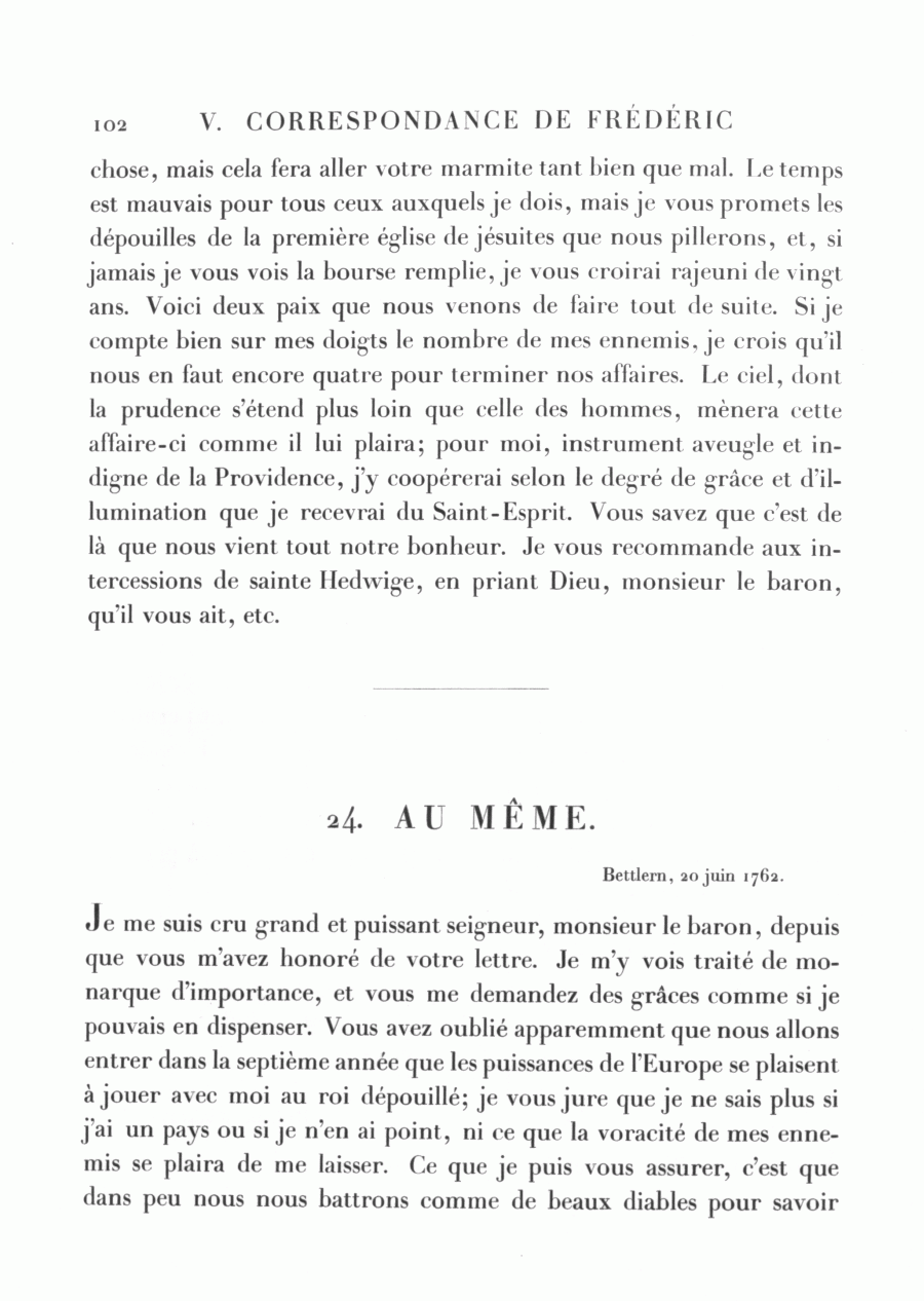 <102> chose, mais cela fera aller votre marmite tant bien que mal. Le temps est mauvais pour tous ceux auxquels je dois, mais je vous promets les dépouilles de la première église de jésuites que nous pillerons, et, si jamais je vous vois la bourse remplie, je vous croirai rajeuni de vingt ans. Voici deux paix que nous venons de faire tout de suite. Si je compte bien sur mes doigts le nombre de mes ennemis, je crois qu'il nous en faut encore quatre pour terminer nos affaires. Le ciel, dont la prudence s'étend plus loin que celle des hommes, mènera cette affaire-ci comme il lui plaira; pour moi, instrument aveugle et indigne de la Providence, j'y coopérerai selon le degré de grâce et d'illumination que je recevrai du Saint-Esprit. Vous savez que c'est de là que nous vient tout notre bonheur. Je vous recommande aux intercessions de sainte Hedwige, en priant Dieu, monsieur le baron, qu'il vous ait, etc.