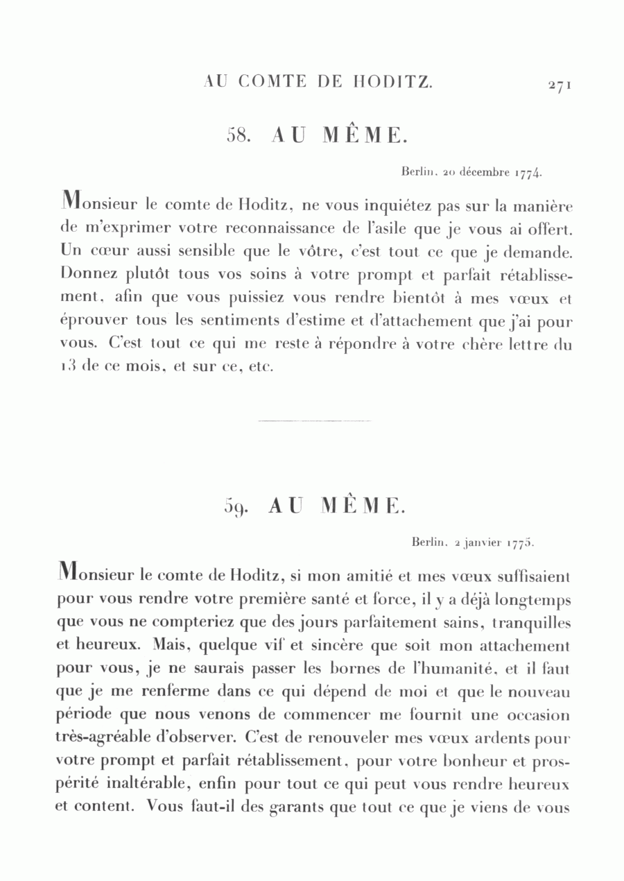 Monsieur le comte de Hoditz, si mon amitié et mes vœux suffisaient pour vous rendre votre première santé et force, il y a déjà longtemps que vous ne compteriez que des jours parfaitement sains, tranquilles et heureux. Mais, quelque vif et sincère que soit mon attachement pour vous, je ne saurais passer les bornes de l'humanité, et il faut que je me renferme dans ce qui dépend de moi et que le nouveau période que nous venons de commencer me fournit une occasion très-agréable d'observer. C'est de renouveler mes vœux ardents pour votre prompt et parfait rétablissement, pour votre bonheur et prospérité inaltérable, enfin pour tout ce qui peut vous rendre heureux et content. Vous faut-il des garants que tout ce que je viens de vous