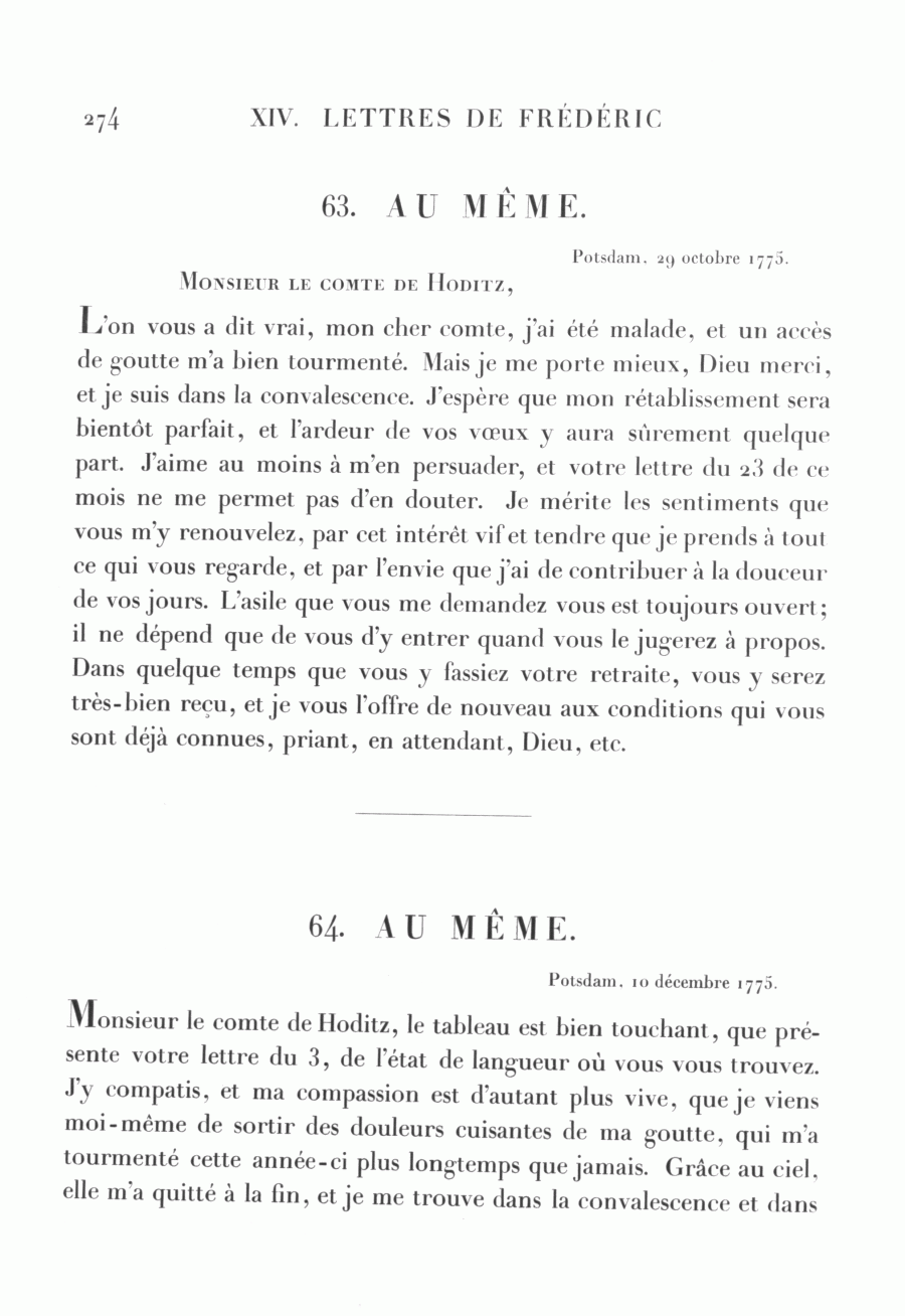 Monsieur le comte de Hoditz, le tableau est bien touchant, que présente votre lettre du 3, de l'état de langueur où vous vous trouvez. J'y compatis, et ma compassion est d'autant plus vive, que je viens moi-même de sortir des douleurs cuisantes de ma goutte, qui m'a tourmenté cette année-ci plus longtemps que jamais. Grâce au ciel, elle m'a quitté à la fin, et je me trouve dans la convalescence et dans