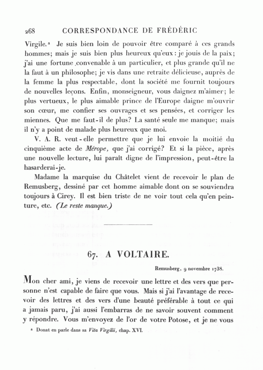 <268> Virgile.a Je suis bien loin de pouvoir être comparé à ces grands hommes; mais je suis bien plus heureux qu'eux : je jouis de la paix; j'ai une fortune convenable à un particulier, et plus grande qu'il ne la faut à un philosophe; je vis dans une retraite délicieuse, auprès de la femme la plus respectable, dont la société me fournit toujours de nouvelles leçons. Enfin, monseigneur, vous daignez m'aimer; le plus vertueux, le plus aimable prince de l'Europe daigne m'ouvrir son cœur, me confier ses ouvrages et ses pensées, et corriger les miennes. Que me faut-il de plus? La santé seule me manque; mais il n'y a point de malade plus heureux que moi.