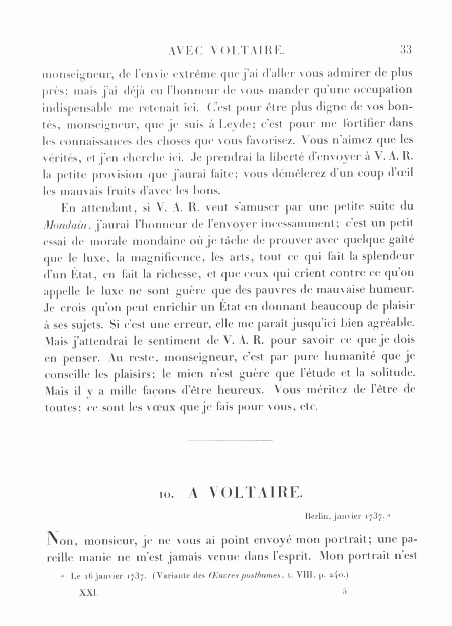 En attendant, si V. A. R. veut s'amuser par une petite suite du Mondain, j'aurai l'honneur de l'envoyer incessamment; c'est un petit essai de morale mondaine où je tâche de prouver avec quelque gaîté que le luxe, la magnificence, les arts, tout ce qui fait la splendeur d'un État, en fait la richesse, et que ceux qui crient contre ce qu'on appelle le luxe ne sont guère que des pauvres de mauvaise humeur. Je crois qu'on peut enrichir un État en donnant beaucoup de plaisir à ses sujets. Si c'est une erreur, elle me paraît jusqu'ici bien agréable. Mais j'attendrai le sentiment de V. A. R. pour savoir ce que je dois en penser. Au reste, monseigneur, c'est par pure humanité que je conseille les plaisirs; le mien n'est guère que l'étude et la solitude. Mais il y a mille façons d'être heureux. Vous méritez de l'être de toutes : ce sont les vœux que je fais pour vous, etc.