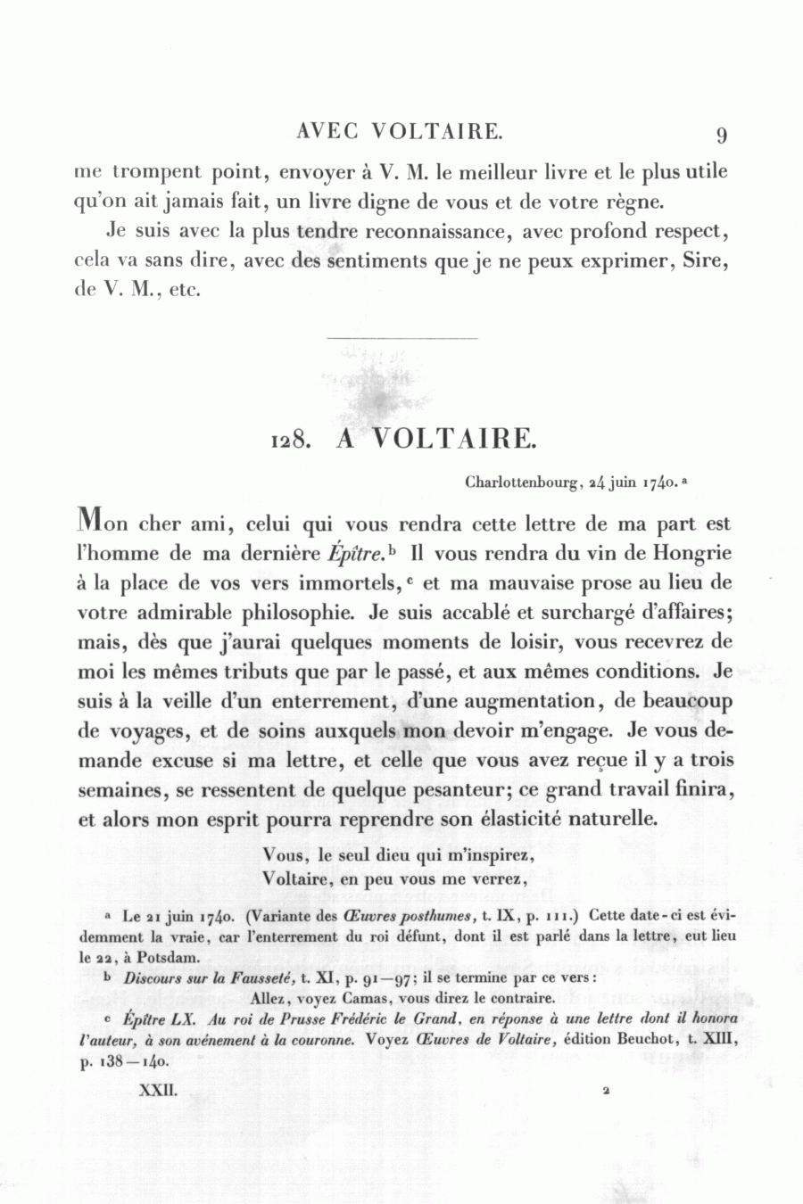 c Épître LX. Au roi de Prusse Frédéric le Grand, en réponse à une lettre dont il honora l'auteur, à son avénement à la couronne. Voyez Œuvres de Voltaire, édition Beuchot, t. XIII, p. 138-140.