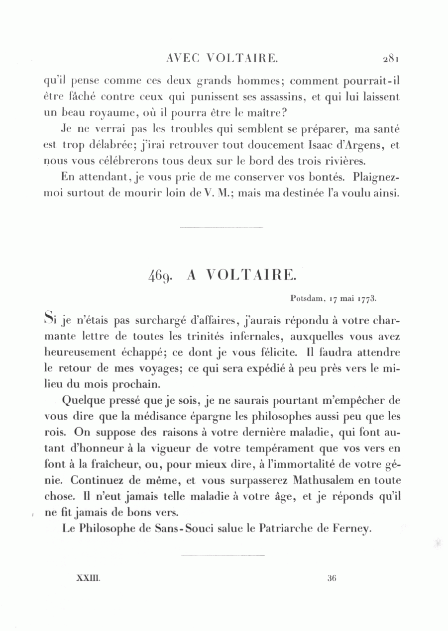 Le Philosophe de Sans-Souci salue le Patriarche de Ferney.