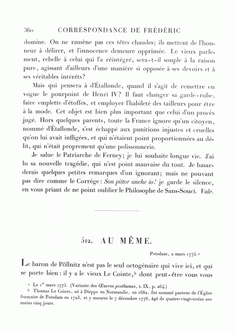 b Thomas Le Cointe, né à Dieppe en Normandie, en 1682, fut nommé pasteur de l'Église française de Potsdam en 1723, et y mourut le 7 décembre 1776, âgé de quatre-vingt-treize ans moins cinq jours.