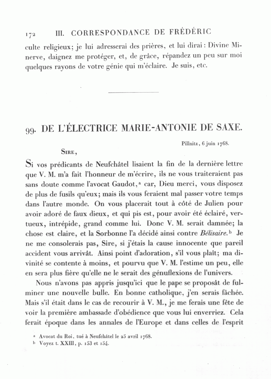 Si vos prédicants de Neufchâtel lisaient la fin de la dernière lettre que V. M. m'a fait l'honneur de m'écrire, ils ne vous traiteraient pas sans doute comme l'avocat Gaudot,a car, Dieu merci, vous disposez de plus de fusils qu'eux; mais ils vous feraient mal passer votre temps dans l'autre monde. On vous placerait tout à côté de Julien pour avoir adoré de faux dieux, et qui pis est, pour avoir été éclairé, vertueux, intrépide, grand comme lui. Donc V. M. serait damnée; la chose est claire, et la Sorbonne l'a décidé ainsi contre Bélisaire.b Je ne me consolerais pas, Sire, si j'étais la cause innocente que pareil accident vous arrivât. Ainsi point d'adoration, s'il vous plaît; ma divinité se contente à moins, et pourvu que V. M. l'estime un peu, elle en sera plus fière qu'elle ne le serait des génuflexions de l'univers.
