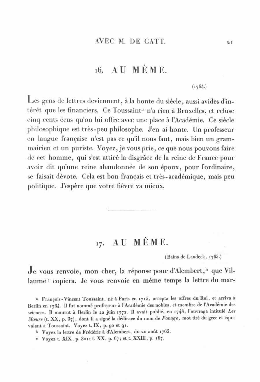 a François-Vincent Toussaint, né à Paris en 1715, accepta les offres du Roi, et arriva à Berlin en 1764. Il fut nommé professeur à l'Académie des nobles, et membre de l'Académie des sciences. Il mourut à Berlin le 22 juin 1772. Il avait publié, en 1748, l'ouvrage intitulé Les Mœurs (t. XX, p. 37), dont il a signé la dédicace du nom de Panage, mot tiré du grec et équivalant à Toussaint. Voyez t. IX, p. 90 et 91.