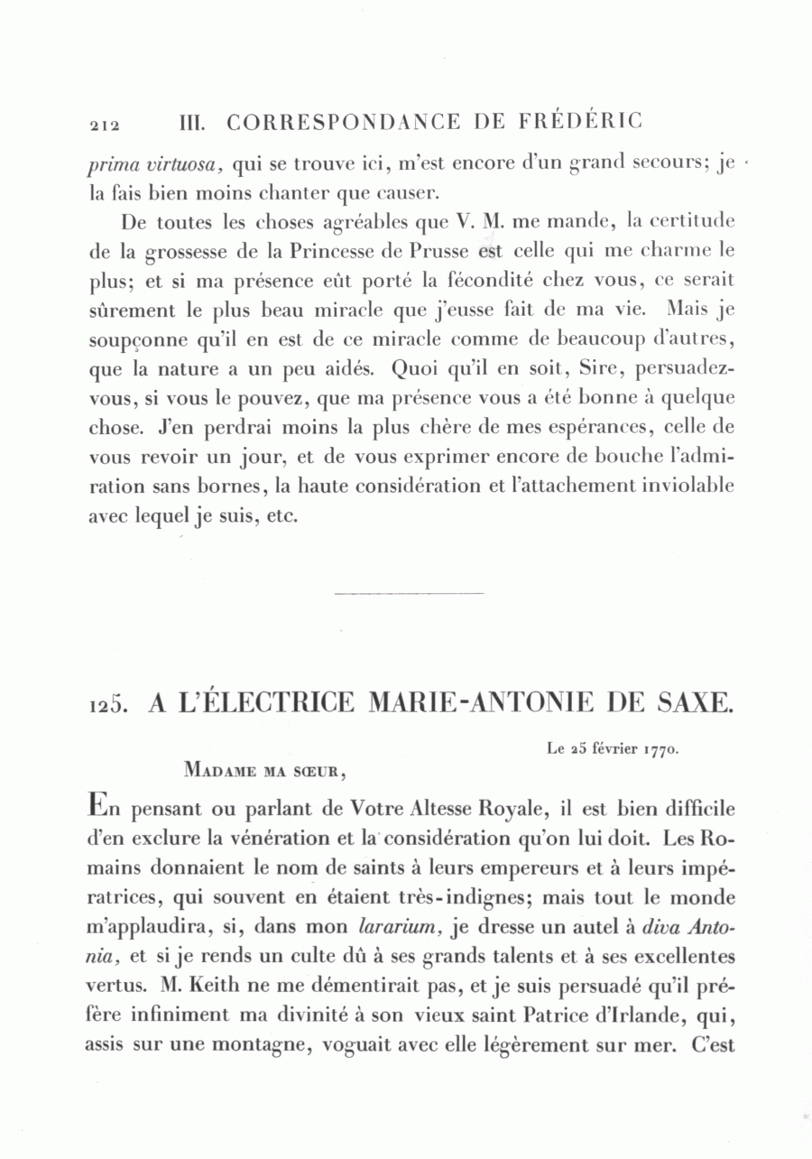 En pensant ou parlant de Votre Altesse Royale, il est bien difficile d'en exclure la vénération et la considération qu'on lui doit. Les Romains donnaient le nom de saints à leurs empereurs et à leurs impératrices, qui souvent en étaient très-indignes; mais tout le monde m'applaudira, si, dans mon lararium, je dresse un autel à diva Antonia, et si je rends un culte dû à ses grands talents et à ses excellentes vertus. M. Keith ne me démentirait pas, et je suis persuadé qu'il préfère infiniment ma divinité à son vieux saint Patrice d'Irlande, qui, assis sur une montagne, voguait avec elle légèrement sur mer. C'est