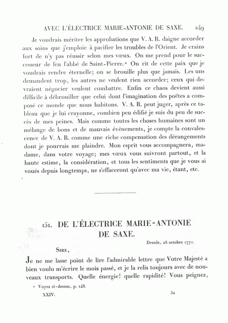 <249>Je voudrais mériter les approbations que V. A. R. daigne accorder aux soins que j'emploie à pacifier les troubles de l'Orient. Je crains fort de n'y pas réussir selon mes vœux. On me prend pour le successeur de feu l'abbé de Saint-Pierre.a On rit de cette paix que je voudrais rendre éternelle; on se brouille plus que jamais. Les uns demandent trop, les autres ne veulent rien accorder; ceux qui devraient négocier veulent combattre. Enfin ce chaos devient aussi difficile à débrouiller que celui dont l'imagination des poëtes a composé ce monde que nous habitons. V. A. R. peut juger, après ce tableau que je lui crayonne, combien peu édifié je suis du peu de succès de mes peines. Mais comme toutes les choses humaines sont un mélange de bons et de mauvais événements, je compte la convalescence de V. A. R. comme une riche compensation des dérangements dont je pourrais me plaindre. Mon esprit vous accompagnera, madame, dans votre voyage; mes vœux vous suivront partout, et la haute estime, la considération, et tous les sentiments que je vous ai voués depuis longtemps, ne s'effaceront qu'avec ma vie, étant, etc.