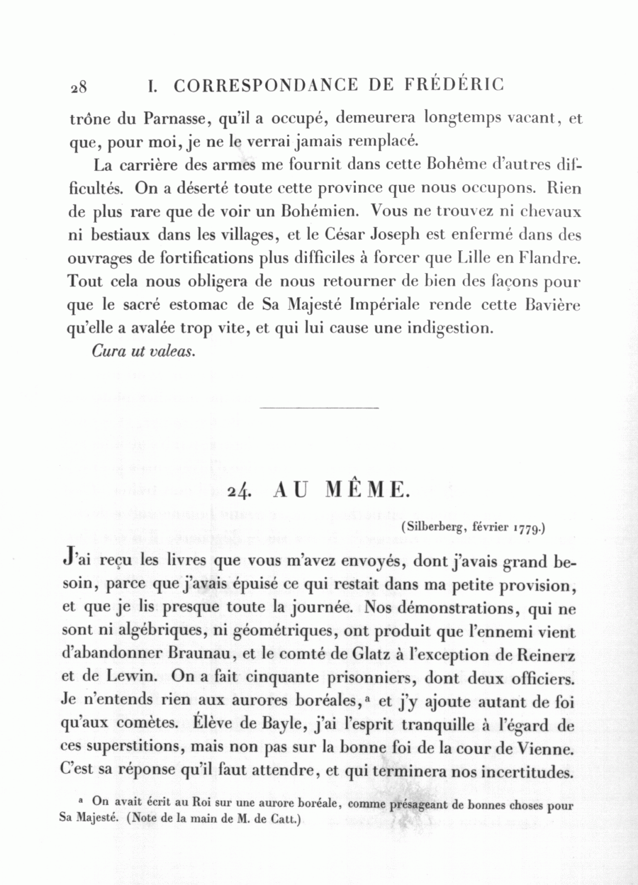 J'ai reçu les livres que vous m'avez envoyés, dont j'avais grand besoin, parce que j'avais épuisé ce qui restait dans ma petite provision, et que je lis presque toute la journée. Nos démonstrations, qui ne sont ni algébriques, ni géométriques, ont produit que l'ennemi vient d'abandonner Braunau, et le comté de Glatz à l'exception de Reinerz et de Lewin. On a fait cinquante prisonniers, dont deux officiers. Je n'entends rien aux aurores boréales,a et j'y ajoute autant de foi qu'aux comètes. Élève de Bayle, j'ai l'esprit tranquille à l'égard de ces superstitions, mais non pas sur la bonne foi de la cour de Vienne. C'est sa réponse qu'il faut attendre, et qui terminera nos incertitudes.