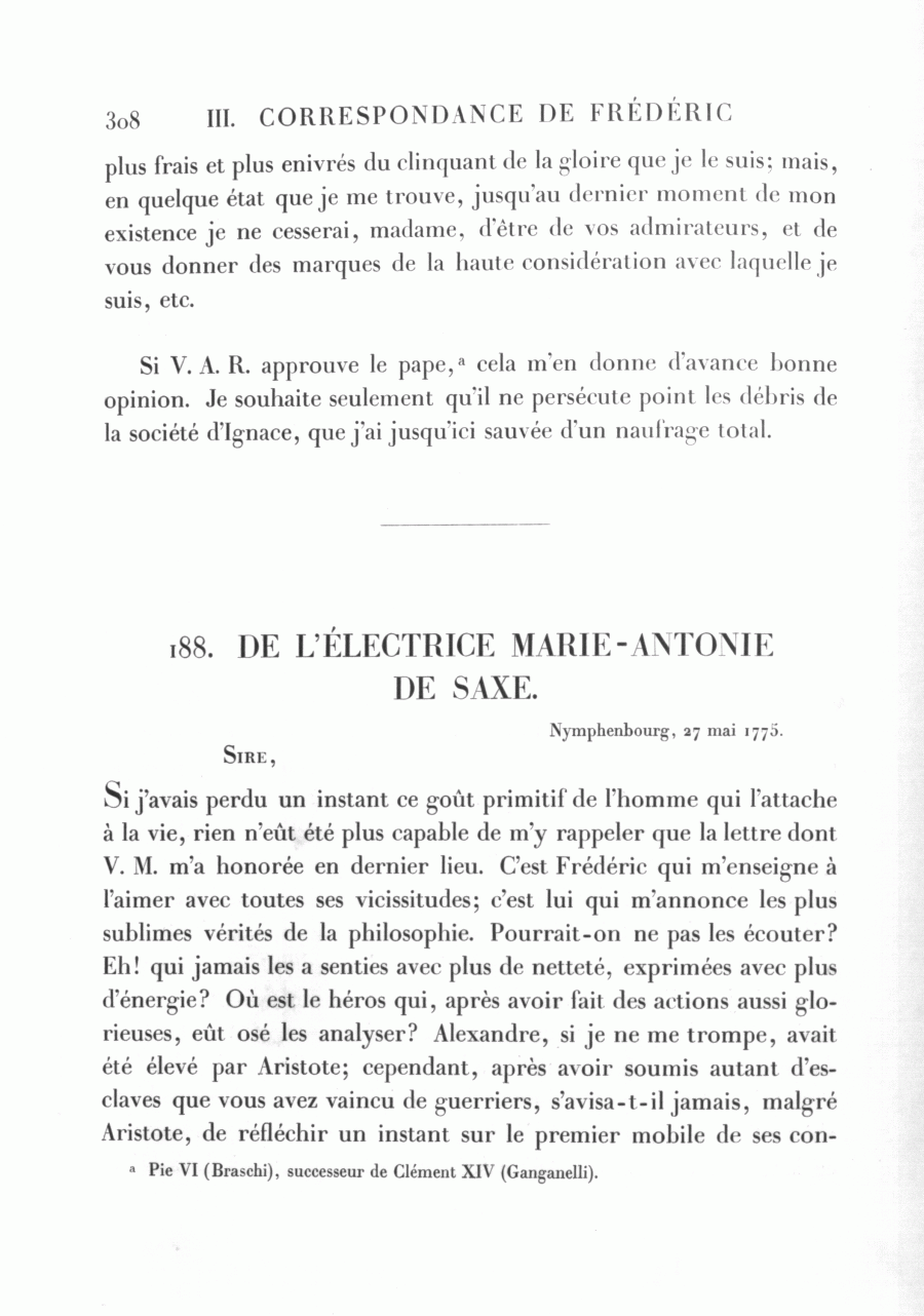 Si V. A. R. approuve le pape,a cela m'en donne d'avance bonne opinion. Je souhaite seulement qu'il ne persécute point les débris de la société d'Ignace, que j'ai jusqu'ici sauvée d'un naufrage total.
