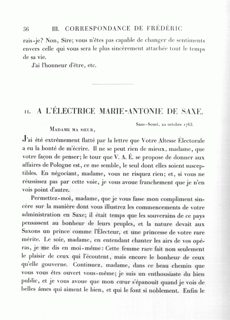 Permettez-moi, madame, que je vous fasse mon compliment sincère sur la manière dont vous illustrez les commencements de votre administration en Saxe; il était temps que les souverains de ce pays pensassent au bonheur de leurs peuples, et la nature devait aux Saxons un prince comme l'Électeur, et une princesse de votre rare mérite. Le soir, madame, en entendant chanter les airs de vos opéras, je me dis en moi-même : Cette femme rare fait non seulement le plaisir de ceux qui l'écoutent, mais encore le bonheur de ceux qu'elle gouverne. Continuez, madame, dans ce beau chemin que vous vous êtes ouvert vous-même; je suis un enthousiaste du bien public, et je vous avoue que mon cœur s'épanouit quand je vois de belles âmes qui aiment le bien, et qui le font si noblement. Enfin le