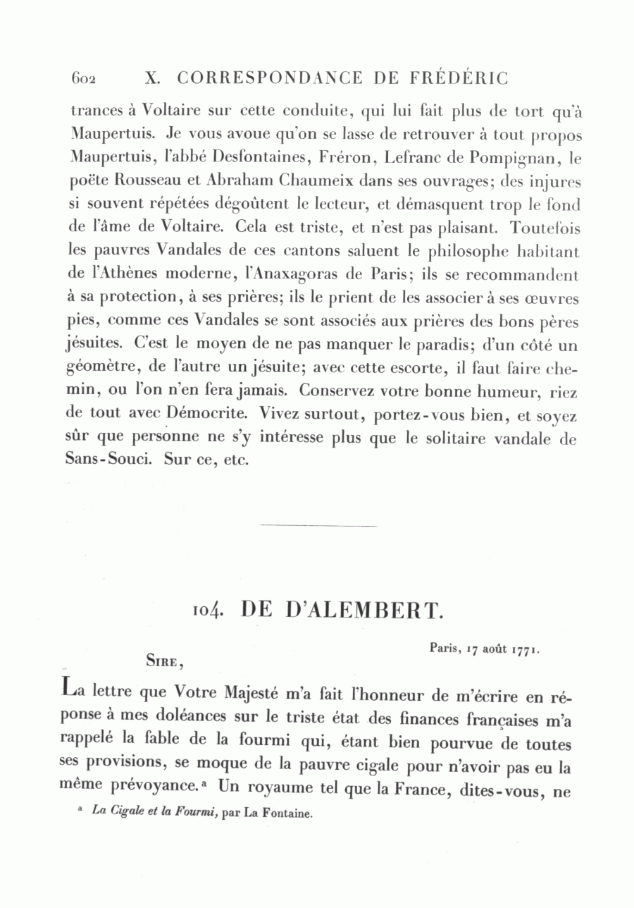 La lettre que Votre Majesté m'a fait l'honneur de m'écrire en réponse à mes doléances sur le triste état des finances françaises m'a rappelé la fable de la fourmi qui, étant bien pourvue de toutes ses provisions, se moque de la pauvre cigale pour n'avoir pas eu la même prévoyance.a Un royaume tel que la France, dites-vous, ne