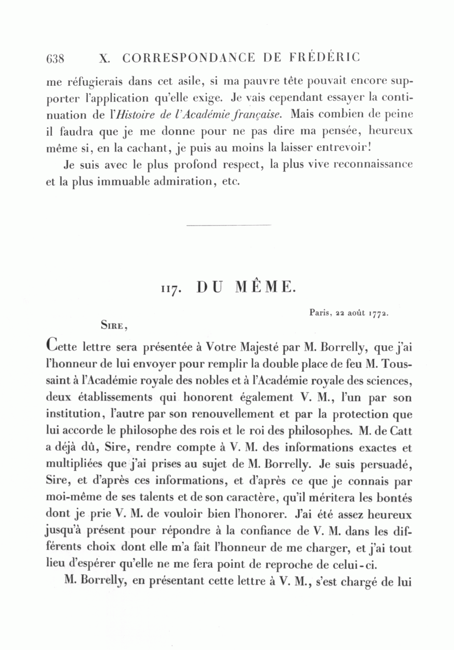 Cette lettre sera présentée à Votre Majesté par M. Borrelly, que j'ai l'honneur de lui envoyer pour remplir la double place de feu M. Toussaint à l'Académie royale des nobles et à l'Académie royale des sciences, deux établissements qui honorent également V. M., l'un par son institution, l'autre par son renouvellement et par la protection que lui accorde le philosophe des rois et le roi des philosophes. M. de Catt a déjà dû, Sire, rendre compte à V. M. des informations exactes et multipliées que j'ai prises au sujet de M. Borrelly. Je suis persuadé, Sire, et d'après ces informations, et d'après ce que je connais par moi-même de ses talents et de son caractère, qu'il méritera les bontés dont je prie V. M. de vouloir bien l'honorer. J'ai été assez heureux jusqu'à présent pour répondre à la confiance de V. M. dans les différents choix dont elle m'a fait l'honneur de me charger, et j'ai tout lieu d'espérer qu'elle ne me fera point de reproche de celui-ci.