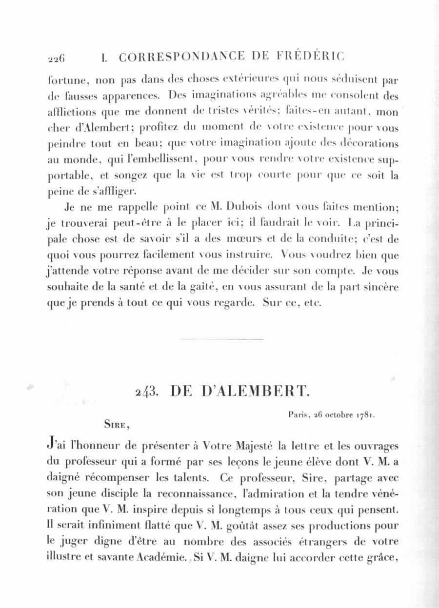 J'ai l'honneur de présenter à Votre Majesté la lettre et les ouvrages du professeur qui a formé par ses leçons le jeune élève dont V. M. a daigné récompenser les talents. Ce professeur, Sire, partage avec son jeune disciple la reconnaissance, l'admiration et la tendre vénération que V. M. inspire depuis si longtemps à tous ceux qui pensent. Il serait infiniment flatté que V. M. goûtât assez ses productions pour le juger digne d'être au nombre des associés étrangers de votre illustre et savante Académie. Si V. M. daigne lui accorder cette grâce,