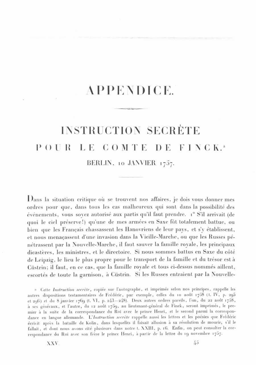 a Cette Instruction secrète, copiée sur l'autographe, et imprimée selon nos principes, rappelle les autres dispositions testamentaires de Frédéric, par exemple, celles du 10 août 1758 (t. IV, p. 295 et 296) et du 8 janvier 1769 (t. VI, p. 243-248). Deux autres ordres pareils, l'un, du 22 août 1758, à ses généraux, et l'autre, du 12 août 1759, au lieutenant-général de Finck, seront imprimés, le premier à la suite de la correspondance du Roi avec le prince Henri, et le second parmi la correspondance en langue allemande. L'Instruction secrète rappelle aussi les lettres et les poésies que Frédéric écrivit après la bataille de Kolin, dans lesquelles il faisait allusion à sa résolution de mourir, s'il le fallait, et dont nous avons cité plusieurs dans notre t. XXIII, p. 16. Enfin, on peut consulter la correspondance du Roi avec son frère le prince Henri, à partir de la lettre du 19 novembre 1757.