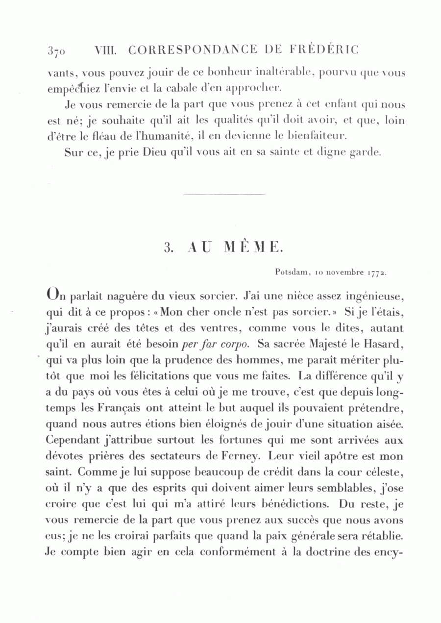 On parlait naguère du vieux sorcier. J'ai une nièce assez ingénieuse, qui dit à ce propos : « Mon cher oncle n'est pas sorcier. » Si je l'étais, j'aurais créé des têtes et des ventres, comme vous le dites, autant qu'il en aurait été besoin per far corpo. Sa sacrée Majesté le Hasard, qui va plus loin que la prudence des hommes, me paraît mériter plutôt que moi les félicitations que vous me faites. La différence qu'il y a du pays où vous êtes à celui où je me trouve, c'est que depuis longtemps les Français ont atteint le but auquel ils pouvaient prétendre, quand nous autres étions bien éloignés de jouir d'une situation aisée. Cependant j'attribue surtout les fortunes qui me sont arrivées aux dévotes prières des sectateurs de Ferney. Leur vieil apôtre est mon saint. Comme je lui suppose beaucoup de crédit dans la cour céleste, où il n'y a que des esprits qui doivent aimer leurs semblables, j'ose croire que c'est lui qui m'a attiré leurs bénédictions. Du reste, je vous remercie de la part que vous prenez aux succès que nous avons eus; je ne les croirai parfaits que quand la paix générale sera rétablie. Je compte bien agir en cela conformément à la doctrine des ency-
