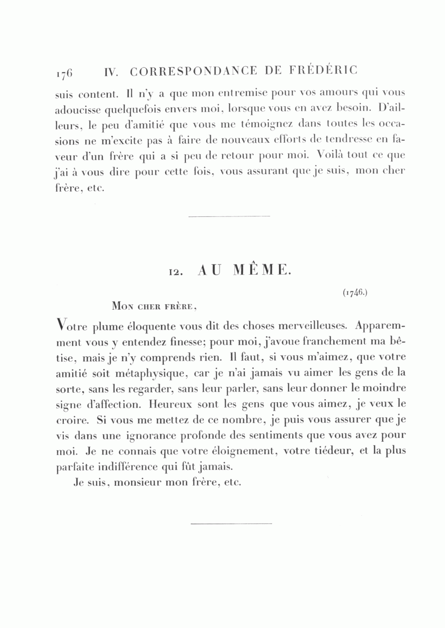 <176> suis content. Il n'y a que mon entremise pour vos amours qui vous adoucisse quelquefois envers moi, lorsque vous en avez besoin. D'ailleurs, le peu d'amitié que vous me témoignez dans toutes les occasions ne m'excite pas à faire de nouveaux efforts de tendresse en faveur d'un frère qui a si peu de retour pour moi. Voilà tout ce que j'ai à vous dire pour cette fois, vous assurant que je suis, mon cher frère, etc.