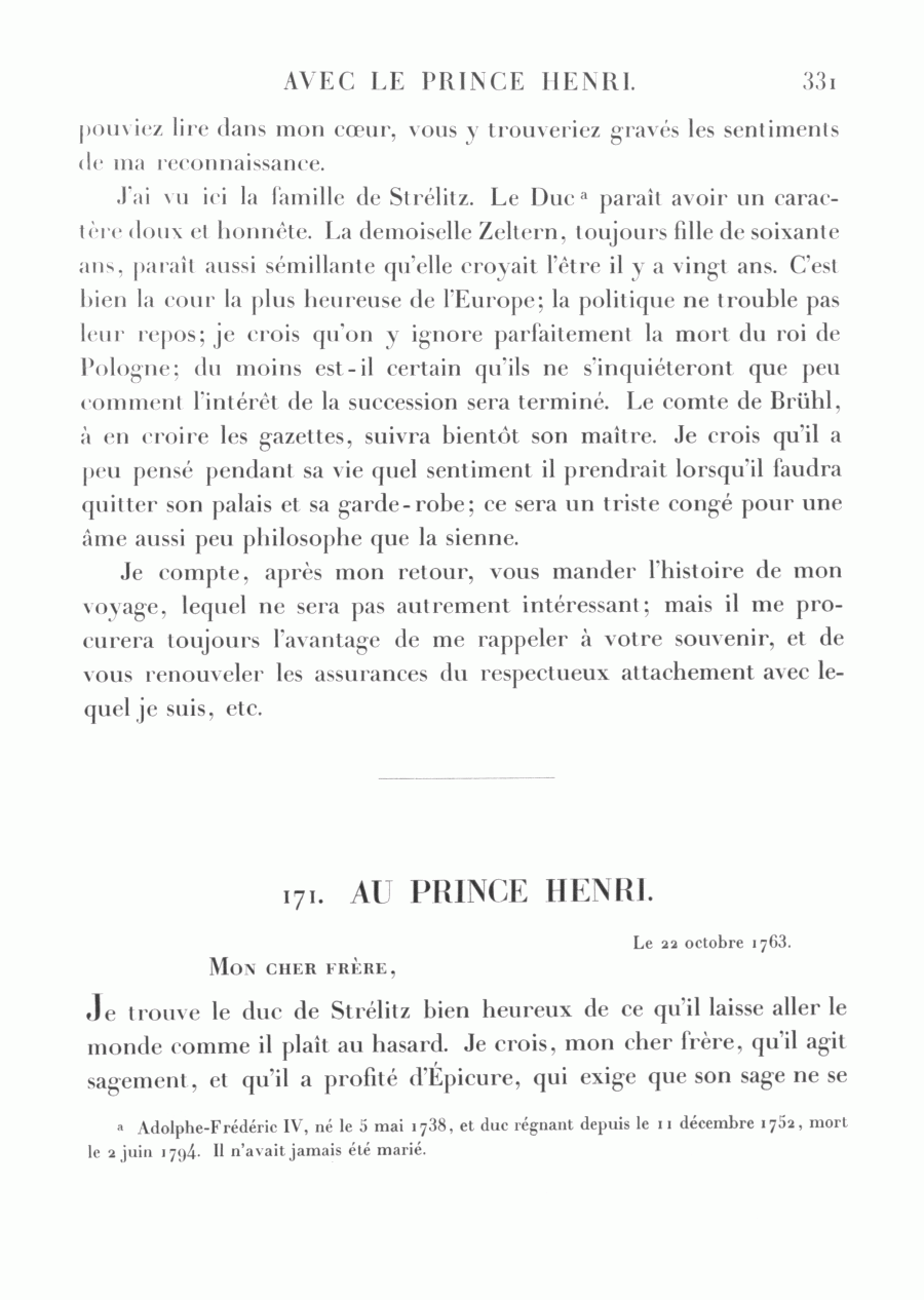Je trouve le duc de Strélitz bien heureux de ce qu'il laisse aller le monde comme il plaît au hasard. Je crois, mon cher frère, qu'il agit sagement, et qu'il a profité d'Épicure, qui exige que son sage ne se