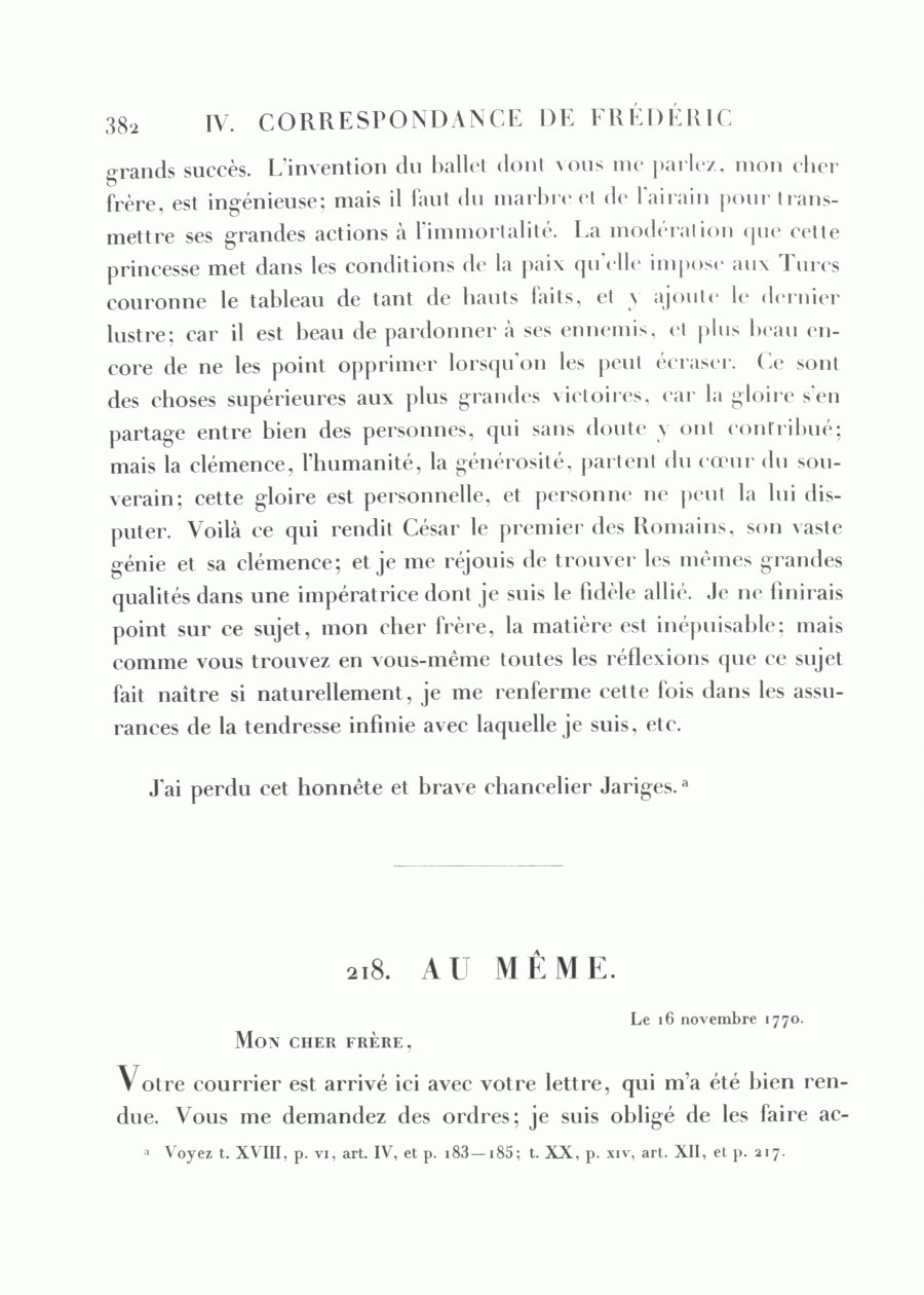 <382> grands succès. L'invention du ballet dont vous me parlez, mon cher frère, est ingénieuse; mais il faut du marbre et de l'airain pour transmettre ses grandes actions à l'immortalité. La modération que cette princesse met dans les conditions de la paix qu'elle impose aux Turcs couronne le tableau de tant de hauts faits, et y ajoute le dernier lustre; car il est beau de pardonner à ses ennemis, et plus beau encore de ne les point opprimer lorsqu'on les peut écraser. Ce sont des choses supérieures aux plus grandes victoires, car la gloire s'en partage entre bien des personnes, qui sans doute y ont contribué; mais la clémence, l'humanité, la générosité, partent du cœur du souverain; cette gloire est personnelle, et personne ne peut la lui disputer. Voilà ce qui rendit César le premier des Romains, son vaste génie et sa clémence; et je me réjouis de trouver les mêmes grandes qualités dans une impératrice dont je suis le fidèle allié. Je ne finirais point sur ce sujet, mon cher frère, la matière est inépuisable; mais comme vous trouvez en vous-même toutes les réflexions que ce sujet fait naître si naturellement, je me renferme cette fois dans les assurances de la tendresse infinie avec laquelle je suis, etc.