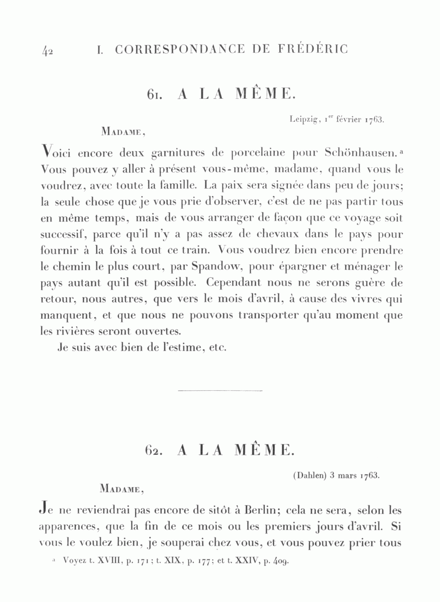 Voici encore deux garnitures de porcelaine pour Schönhausen.a Vous pouvez y aller à présent vous-même, madame, quand vous le voudrez, avec toute la famille. La paix sera signée dans peu de jours; la seule chose que je vous prie d'observer, c'est de ne pas partir tous en même temps, mais de vous arranger de façon que ce voyage soit successif, parce qu'il n'y a pas assez de chevaux dans le pays pour fournir à la fois à tout ce train. Vous voudrez bien encore prendre le chemin le plus court, par Spandow, pour épargner et ménager le pays autant qu'il est possible. Cependant nous ne serons guère de retour, nous autres, que vers le mois d'avril, à cause des vivres qui manquent, et que nous ne pouvons transporter qu'au moment que les rivières seront ouvertes.