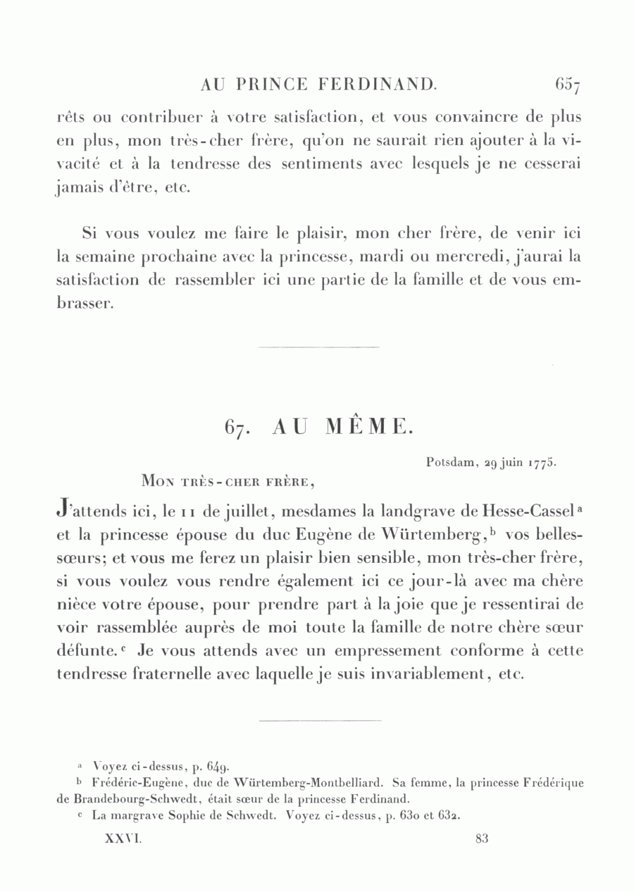 J'attends ici, le 11 de juillet, mesdames la landgrave de Hesse-Cassela et la princesse épouse du duc Eugène de Würtemberg,b vos belles-sœurs; et vous me ferez un plaisir bien sensible, mon très-cher frère, si vous voulez vous rendre également ici ce jour-là avec ma chère nièce votre épouse, pour prendre part à la joie que je ressentirai de voir rassemblée auprès de moi toute la famille de notre chère sœur défunte.c Je vous attends avec un empressement conforme à cette tendresse fraternelle avec laquelle je suis invariablement, etc.
