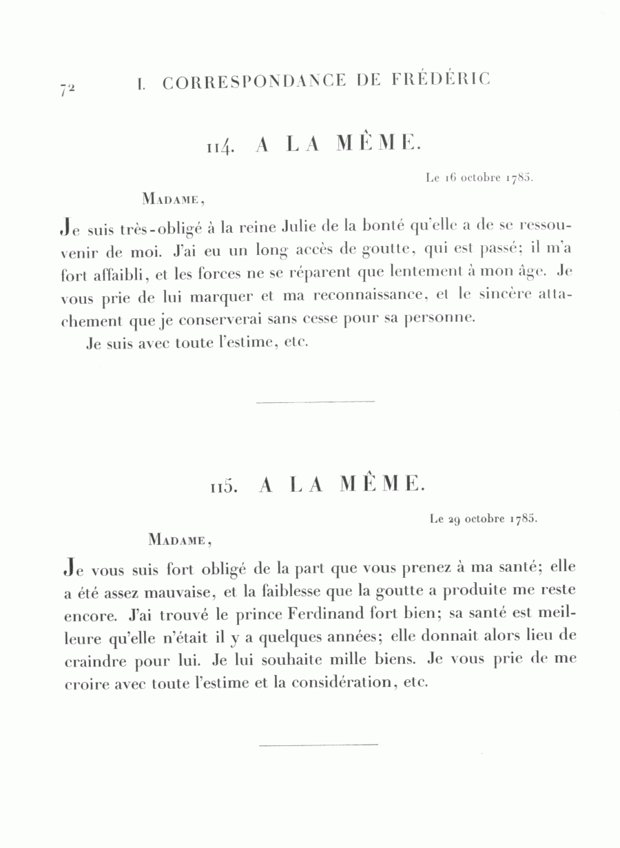 Je suis très-obligé à la reine Julie de la bonté qu'elle a de se ressouvenir de moi. J'ai eu un long accès de goutte, qui est passé; il m'a fort affaibli, et les forces ne se réparent que lentement à mon âge. Je vous prie de lui marquer et ma reconnaissance, et le sincère attachement que je conserverai sans cesse pour sa personne. Je suis avec toute l'estime, etc.