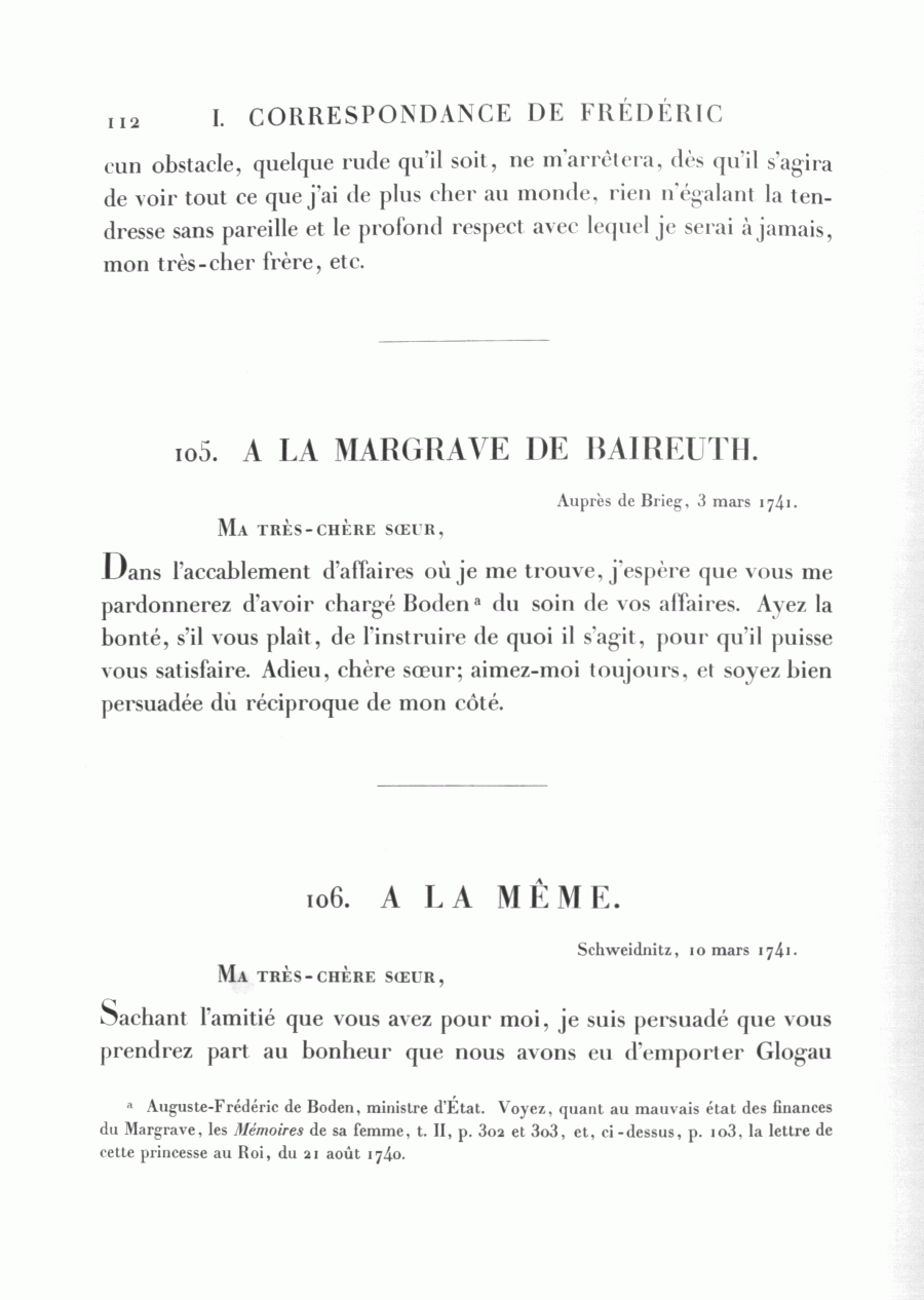 a Auguste-Frédéric de Boden, ministre d'État. Voyez, quant au mauvais état des finances du Margrave, les Mémoires de sa femme, t. II, p. 302 et 303, et, ci-dessus, p. 103, la lettre de cette princesse au Roi, du 21 août 1740.