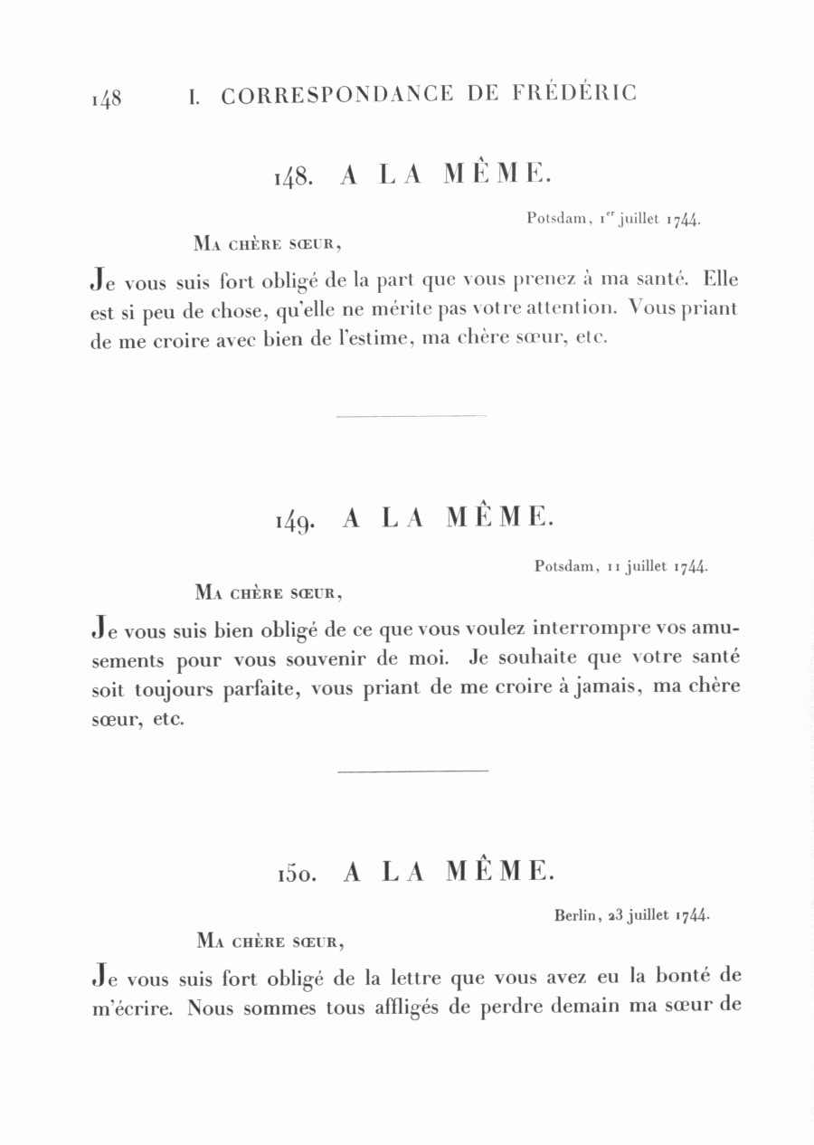 Je vous suis bien obligé de ce que vous voulez interrompre vos amusements pour vous souvenir de moi. Je souhaite que votre santé soit toujours parfaite, vous priant de me croire à jamais, ma chère sœur, etc.
