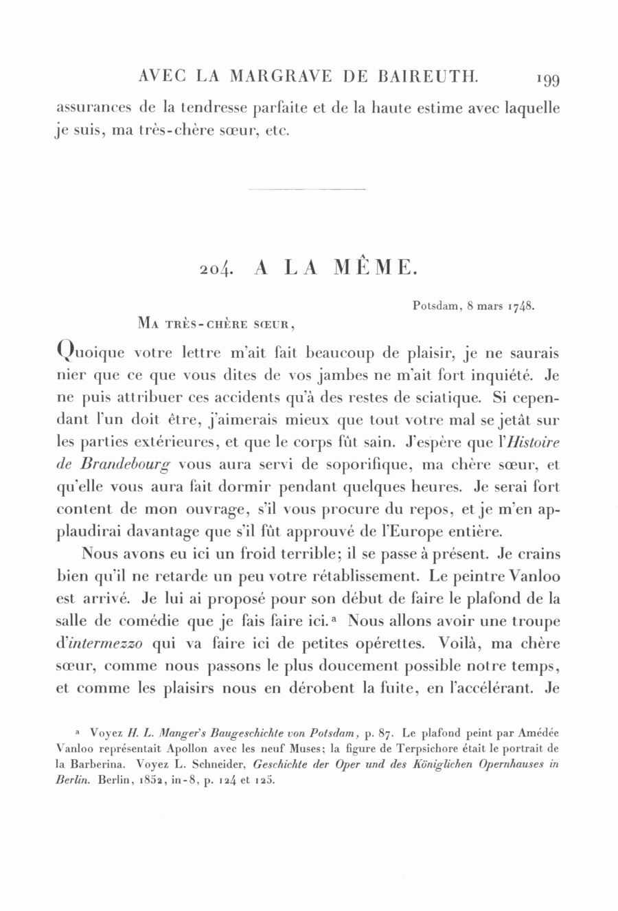 a Voyez H. L. Manger's Baugeschichte von Potsdam, p. 87. Le plafond peint par Amédée Vanloo représentait Apollon avec les neuf Muses; la figure de Terpsichore était le portrait de la Barberina. Voyez L. Schneider, Geschichte der Oper und des Königlichen Opernhauses in Berlin. Berlin, 1852, in-8, p. 124 et 125.