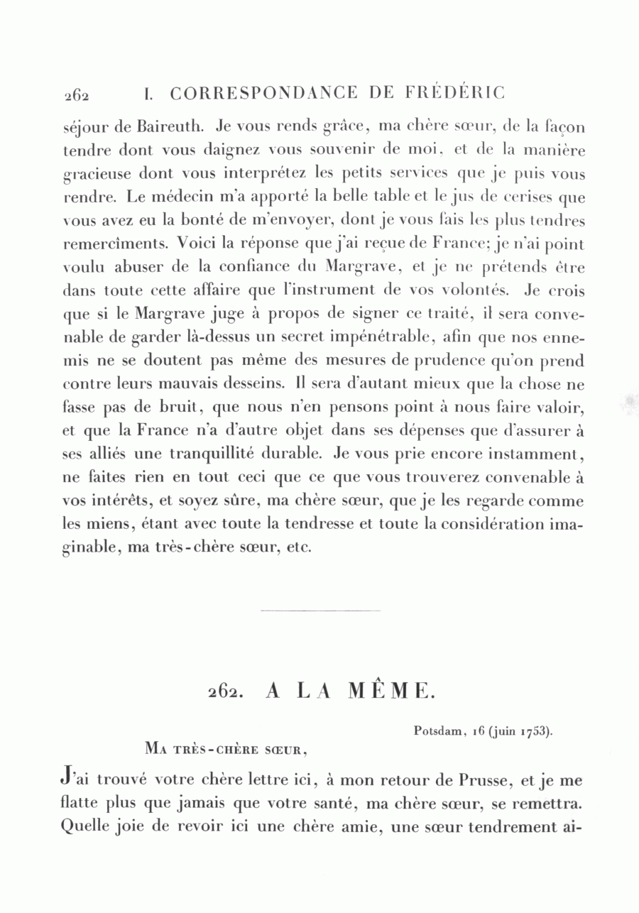 <262> séjour de Baireuth. Je vous rends grâce, ma chère sœur, de la façon tendre dont vous daignez vous souvenir de moi, et de la manière gracieuse dont vous interprétez les petits services que je puis vous rendre. Le médecin m'a apporté la belle table et le jus de cerises que vous avez eu la bonté de m'envoyer, dont je vous fais les plus tendres remercîments. Voici la réponse que j'ai reçue de France; je n'ai point voulu abuser de la confiance du Margrave, et je ne prétends être dans toute cette affaire que l'instrument de vos volontés. Je crois que si le Margrave juge à propos de signer ce traité, il sera convenable de garder là-dessus un secret impénétrable, afin que nos ennemis ne se doutent pas même des mesures de prudence qu'on prend contre leurs mauvais desseins. Il sera d'autant mieux que la chose ne fasse pas de bruit, que nous n'en pensons point à nous faire valoir, et que la France n'a d'autre objet dans ses dépenses que d'assurer à ses alliés une tranquillité durable. Je vous prie encore instamment, ne faites rien en tout ceci que ce que vous trouverez convenable à vos intérêts, et soyez sûre, ma chère sœur, que je les regarde comme les miens, étant avec toute la tendresse et toute la considération imaginable, ma très-chère sœur, etc.