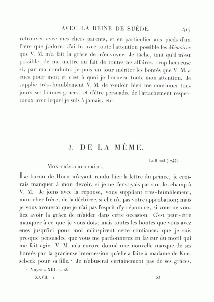 <417> retrouver avec mes chers parents, et en particulier aux pieds d'un frère que j'adore. J'ai lu avec toute l'attention possible les Mémoires que V. M. m'a fait la grâce de m'envoyer. Je tâche, tant qu'il m'est possible, de me mettre au fait de toutes ces affaires, trop heureuse si, par ma conduite, je puis un jour mériter les bontés que V. M. a eues pour moi; et c'est à quoi je bornerai toute mon attention. Je supplie très-humblement V. M. de vouloir bien me continuer toujours ses bonnes grâces, et d'être persuadée de l'attachement respectueux avec lequel je suis à jamais, etc.