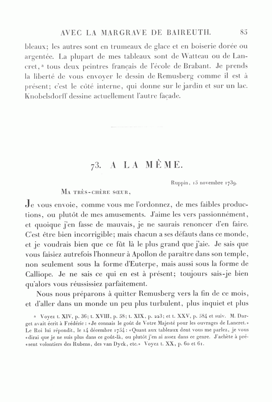 a Voyez t. XIV, p. 36; t. XVIII, p. 58; t. XIX, p. 223; et t. XXV, p. 584 et suiv. M. Darget avait écrit à Frédéric : « Je connais le goût de Votre Majesté pour les ouvrages de Lancret. » Le Roi lui répondit, le 14 décembre 1754 : « Quant aux tableaux dont vous me parlez, je vous dirai que je ne suis plus dans ce goût-là, ou plutôt j'en ai assez dans ce genre. J'achète à présent volontiers des Rubens, des van Dyck, etc. » Voyez t. XX, p. 60 et 61.