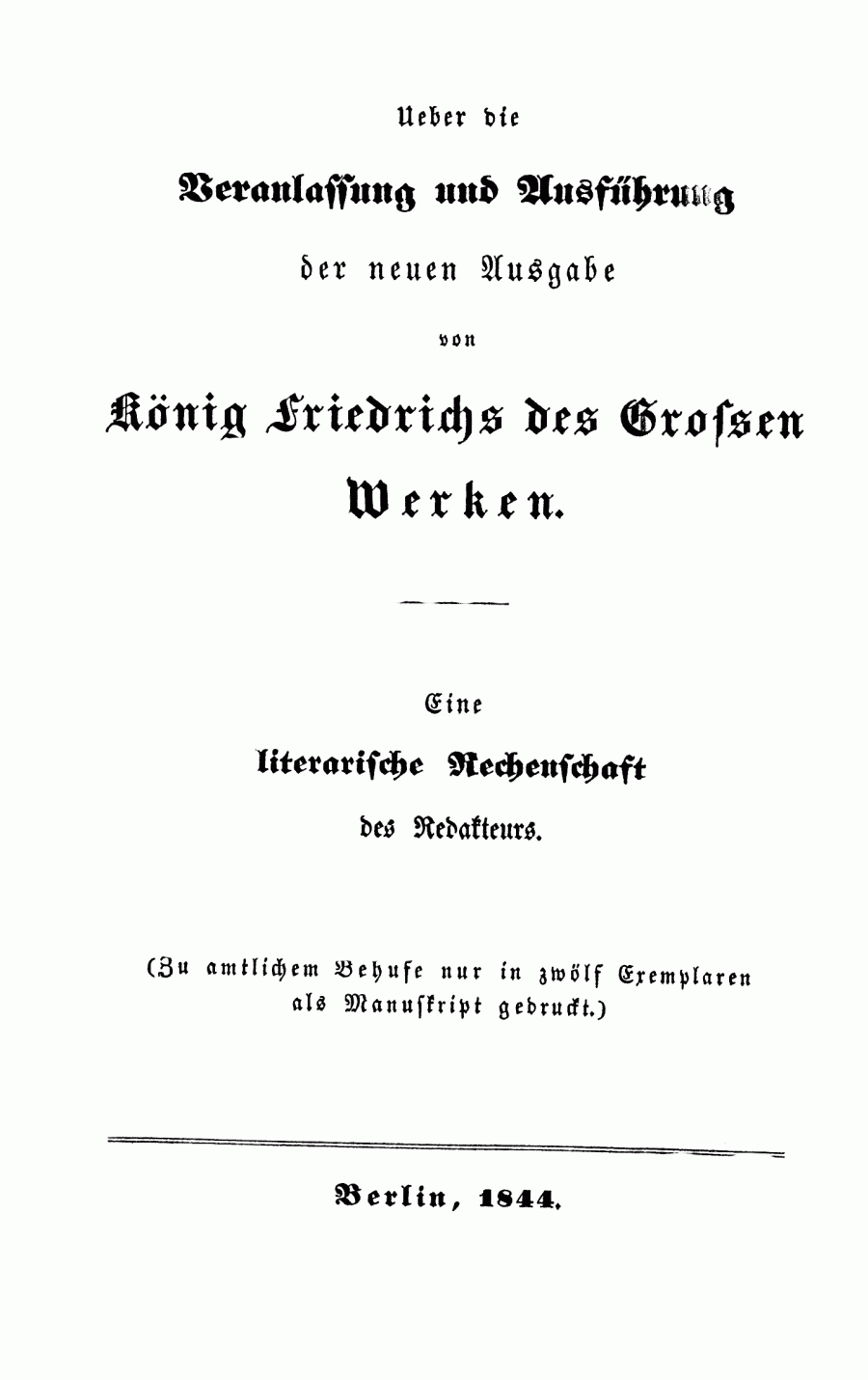 Ueber die Veranlassung und Ausführung der neuen Ausgabe von König Friedrichs des Großen Werken. Eine literarische Rechenschaft des Redakteurs. (Zu amtlichem Behufe nur in zwölf Exemplaren als Manuskript gedruckt.) Berlin, 1844.