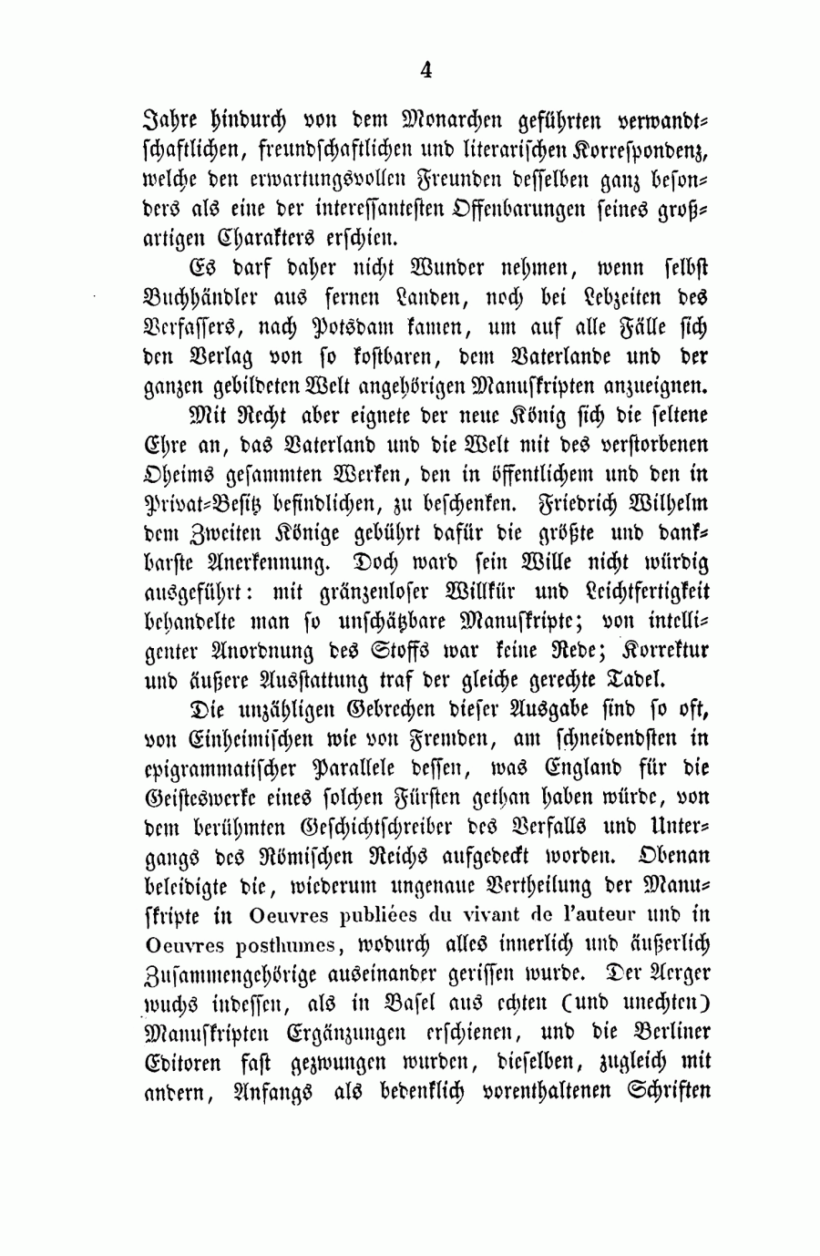 Die unzähligen Gebrechen dieser Ausgabe sind so oft, von Einheimischen wie von Fremden, am schneidendsten in epigrammatischer Parallele dessen, was England für die Geisteswerke eines solchen Fürsten gethan haben würde, von dem berühmten Geschichtschreiber des Verfalls und Untergangs des Römischen Reichs aufgedeckt worden. Obenan beleidigte die, wiederum ungenaue Vertheilung der Manuskripte in Oeuvres publiées du vivant de l'auteur und in Oeuvres posthumes, wodurch alles innerlich und äußerlich Zusammengehörige auseinander gerissen wurde. Der Aerger wuchs indessen, als in Basel aus echten (und unechten) Manuskripten Ergänzungen erschienen, und die Berliner Editoren fast gezwungen wurden, dieselben, zugleich mit andern, Anfangs als bedenklich vorenthaltenen Schriften