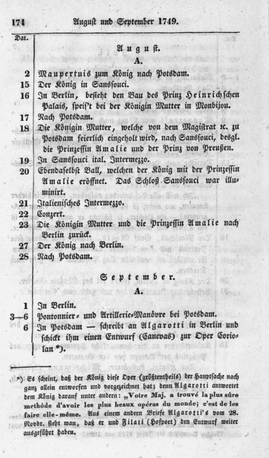 + Es scheint, daß der König diese Oper (größtentheils) der Hauptsache nach ganz allein entworfen und vorgezeichnet hat; denn Algarotti antwortet dem König darauf unter andern: "Votre Maj. a trouvé la plus sûre methôde d'avoir les plus beaux opéras du monde; c'est de les faire elle-même." Aus einem andern Briefe Algarotti's vom 28. Novbr. sieht man, daß er und Filati (Hofpoet) den Entwurf weiter ausgeführt haben.