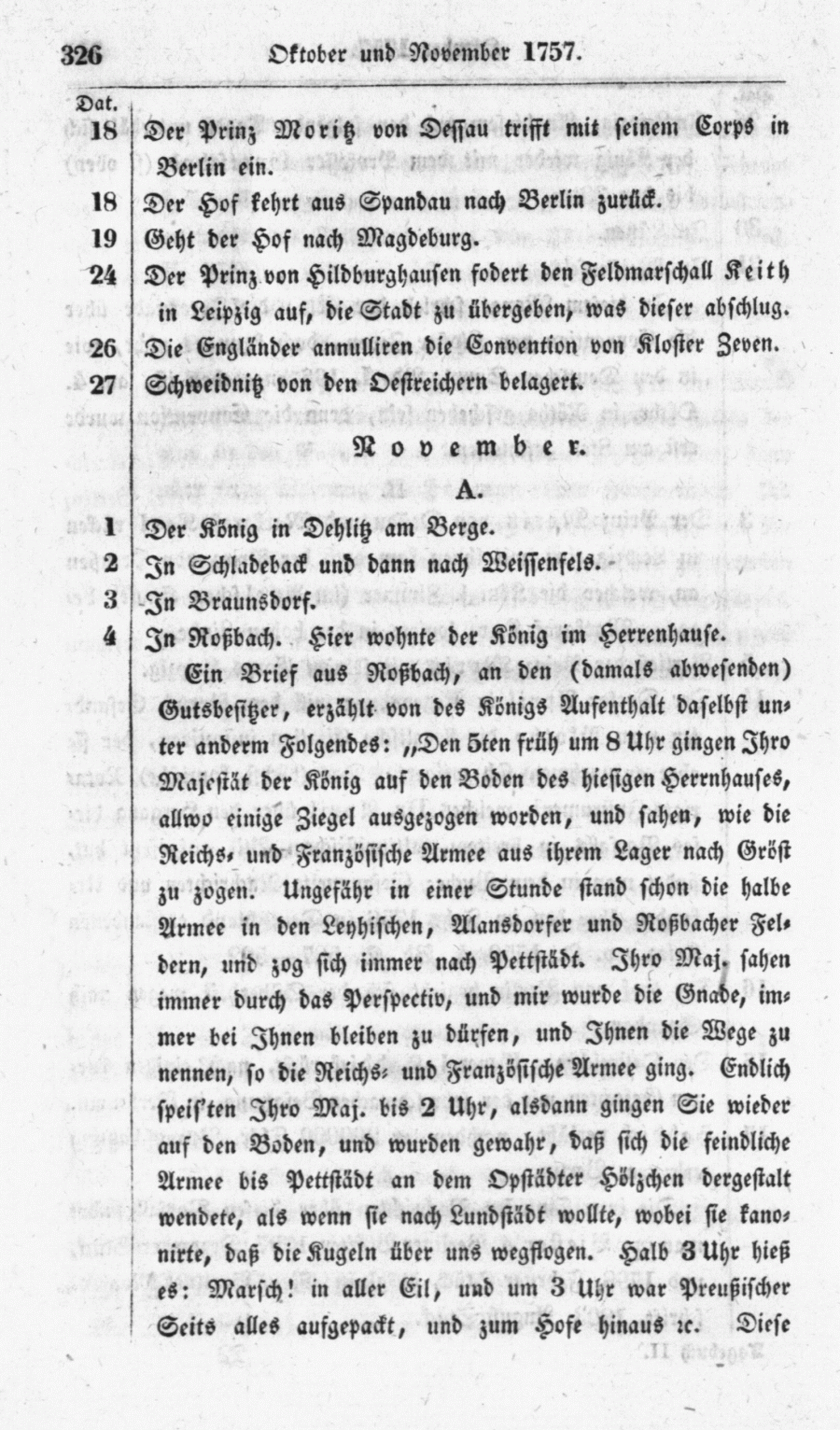 Ein Brief aus Roßbach, an den (damals abwesenden) Gutsbesitzer, erzählt von des Königs Aufenthalt daselbst unter anderm Folgendes: "Den 5ten früh um 8 Uhr gingen Ihro Majestät der König auf den Boden des hiesigen Herrnhauses, allwo einige Ziegel ausgezogen worden, und sahen, wie die Reichs, und Französische Armee aus ihrem Lager nach Gröst zu zogen. Ungefähr in einer Stunde stand schon die halbe Armee in den Leyhischen, Alansdorfer und Roßbacher Feldern, und zog sich immer nach Pettstädt. Ihro Maj. sahen immer durch das Perspectiv, und mir wurde die Gnade, immer bei Ihnen bleiben zu dürfen, und Ihnen die Wege zu nennen, so die Reichs- und Französische Armee ging. Endlich speisten Ihro Maj. bis 2 Uhr, alsdann gingen Sie wieder auf den Boden, und wurden gewahr, baß sich die feindliche Armee bis Pettstädt an dem Opstädter Hölzchen dergestalt wendete, als wenn sie nach Lundstädt wollte, wobei sie kanonirte, daß die Kugeln über uns wegflogen. Halb 3 Uhr hieß es: Marsch! in aller Eil, und um 3 Uhr war Preußischer Seits alles aufgepackt, und zum Hofe hinaus lt. Diese"